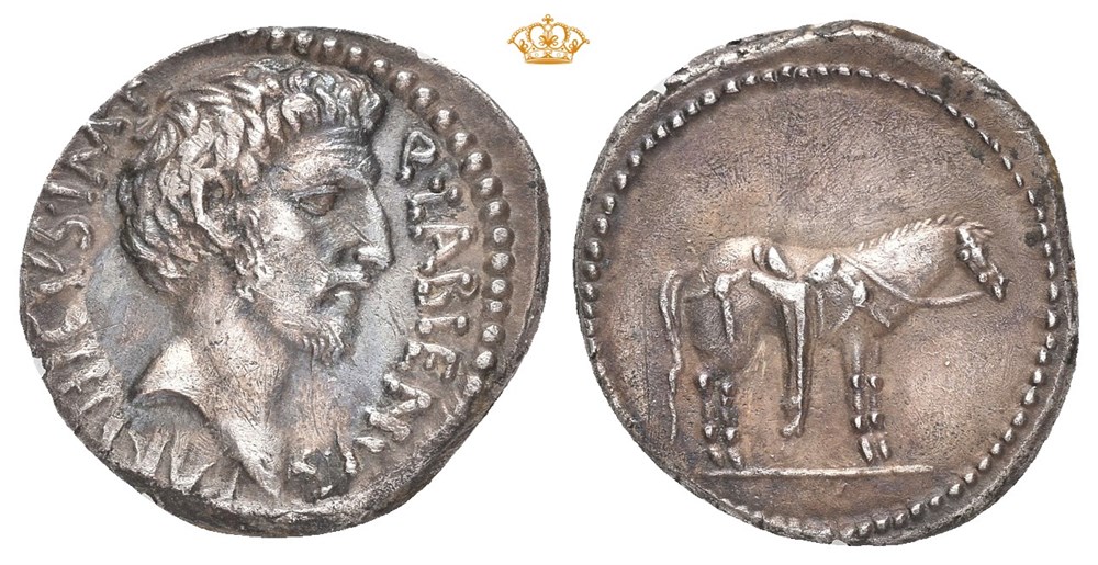 Quintus Labienus. Rebel imperator, 40-39 BC. AR denarius (18.5 mm, 3.79 g). Antioch or uncertain mint in Syria or Asia Minor, early 40 BC. Bare head right, Q • LABIENVS PARTHICVS • IMP around / Horse standing right on ground line, wearing bridle and saddle with quiver attached. Metal slightly crystallized and a few light cleaning marks on obverse. Sharply struck and with a spectacular iridescent toning. Extremely rare and well preserved for type