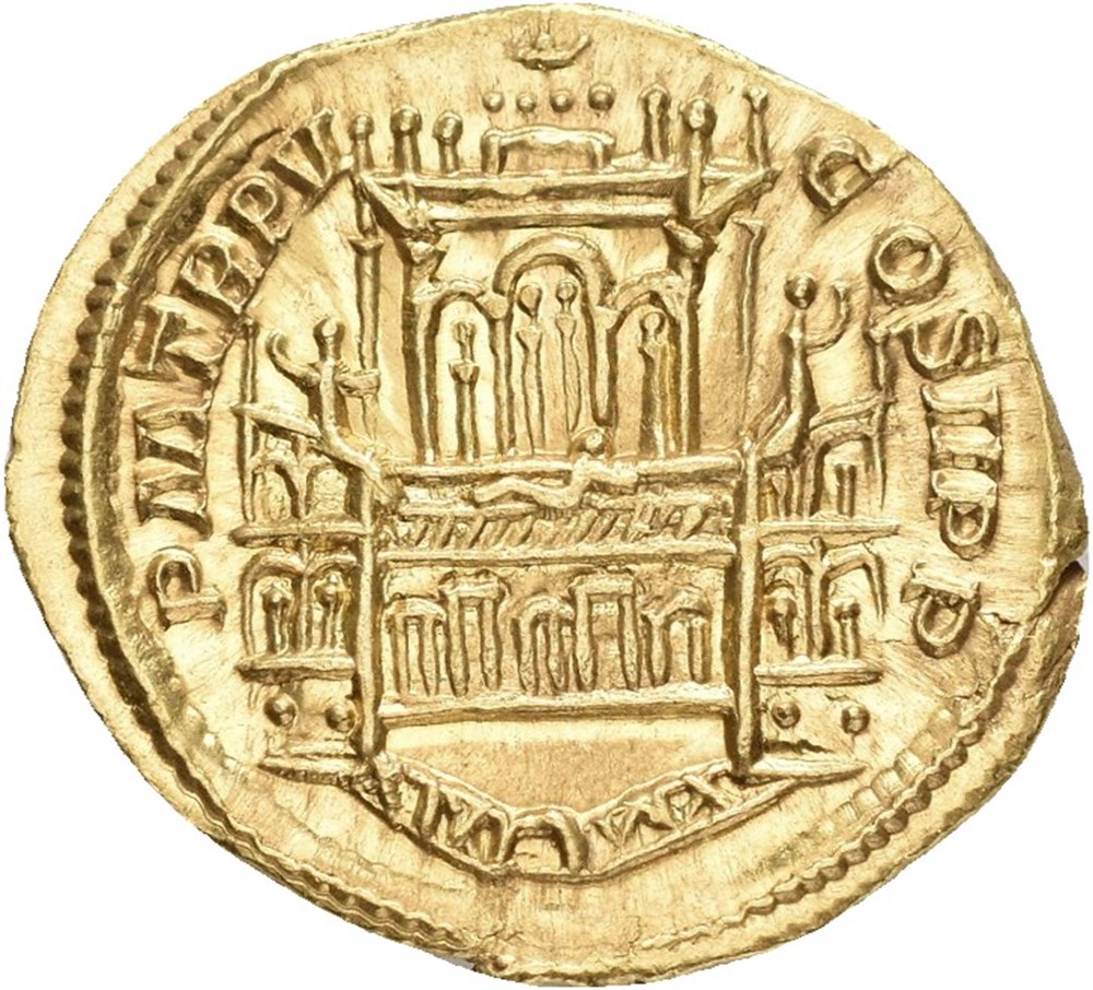 Severus Alexander, AD 222-235. AV aureus (21.0 mm, 5.81 g). Rome mint, struck AD 226. Laureate, draped and cuirassed bust right / Nymphaeum of Severus Alexander; in centre, three arches with the central arch containing two statues and the side arches containing one statue; on roof, facing quadriga flanked by three statues; below, open space with reclined figure; underneath, five arches alternating size; on either side of space, wing of building in three tiers; the two upper stories consisting of two arches, each containing a statue; each wing is surmounted by a statue; fenced semi-circular basin in front of building. Near uncirculated, highly lustrous, and with a portrait in high relief. This issue is of the highest rarity and one of four specimens known and the second known in private collections