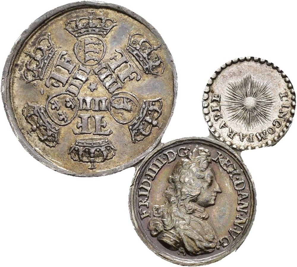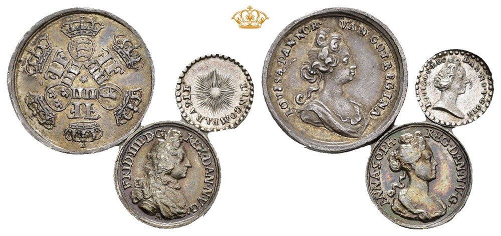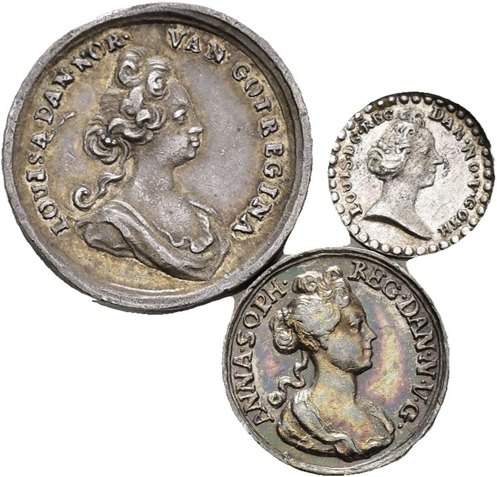 Lot 3 stk.: Dronningen (1 dukat), Kongen og dronningen (1/2 dukat), Dronningen (1/4 dukat). Sølv Ukjente medaljører