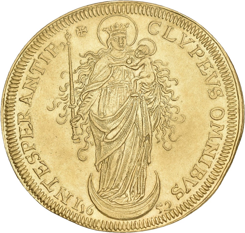 5 ducats 1652 (17.08 g). Nürnberg mint. Mount removed at 12 o' clock and slightly creased. A rare gold strike from the taler dies