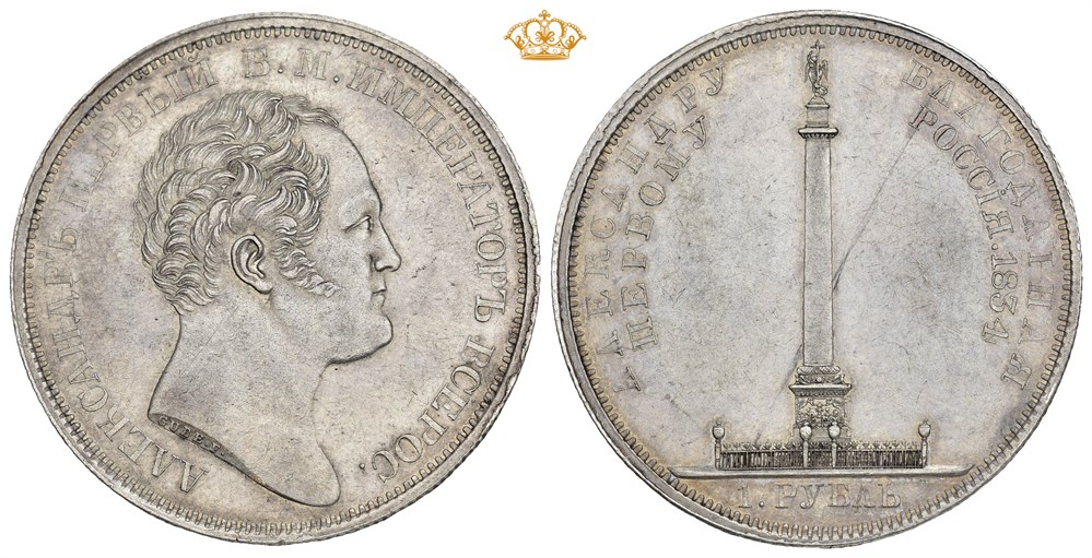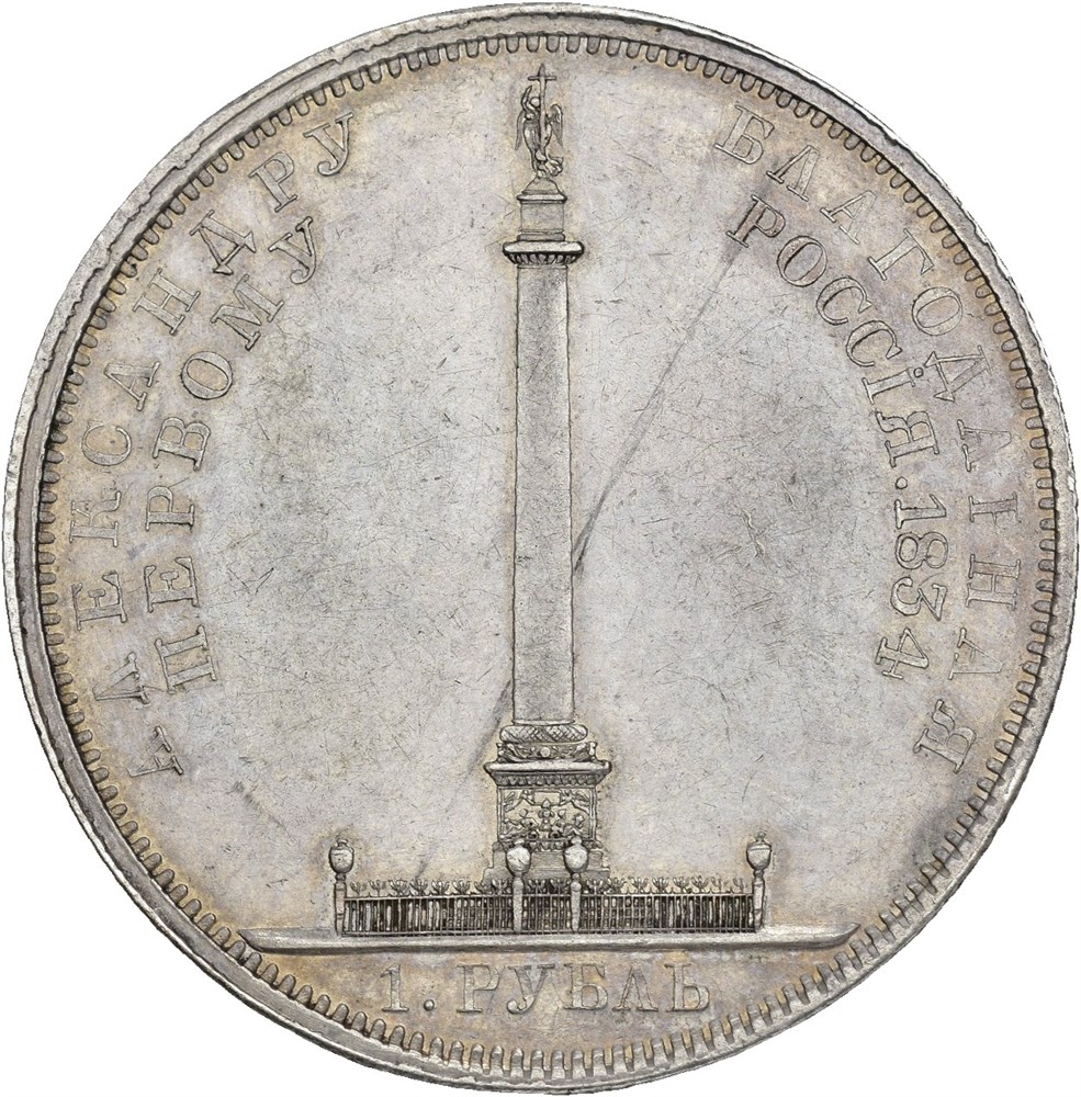 Rouble 1834. St. Petersburg mint. Traces of light cleaning in fields an a single hairline on reverse. Struck to commemorate the unveiling of Alexander I´s column in St. Petersburg