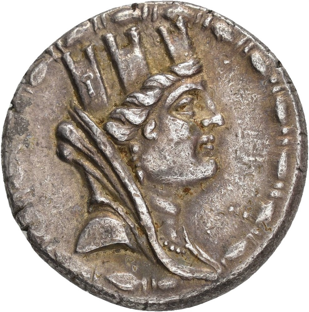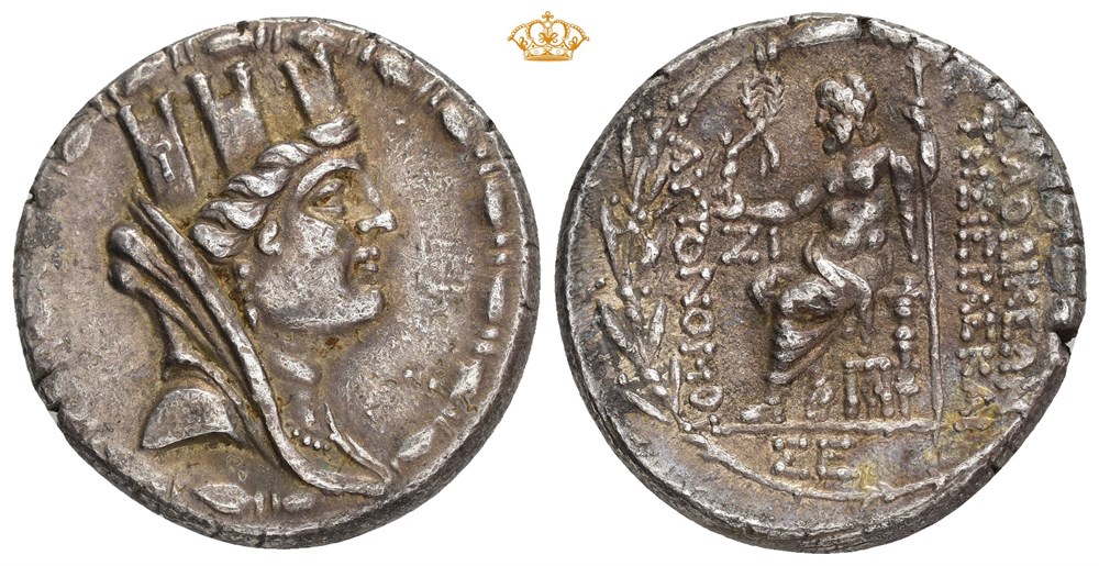 SELEUKIS & PIERIA, Laodikeia. 78/7-16/5 BC. AR tetradrachm (27.5 mm, 15.13 g). Dated CY 17 (=65/4 BC). Veiled, draped, and turreted bust of Tyche right / ΛΑΟΔΙΚΕΩΝ / ΤΗΣ ΙΕΡΑΣ ΚΑΙ / ΑΥΤΟΝΟΜΟV, Zeus Nikephoros seated left, holding Nike with wreath in outstretched right hand and resting on grounded scepter with left; ZI (date) to inner left; monogram below throne, ΣE in exergue; all within wreath. Light porosity in fields. Deep iridescent toning