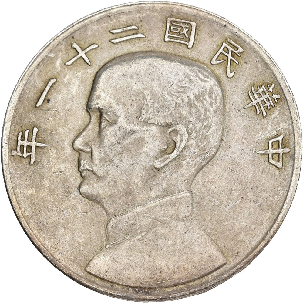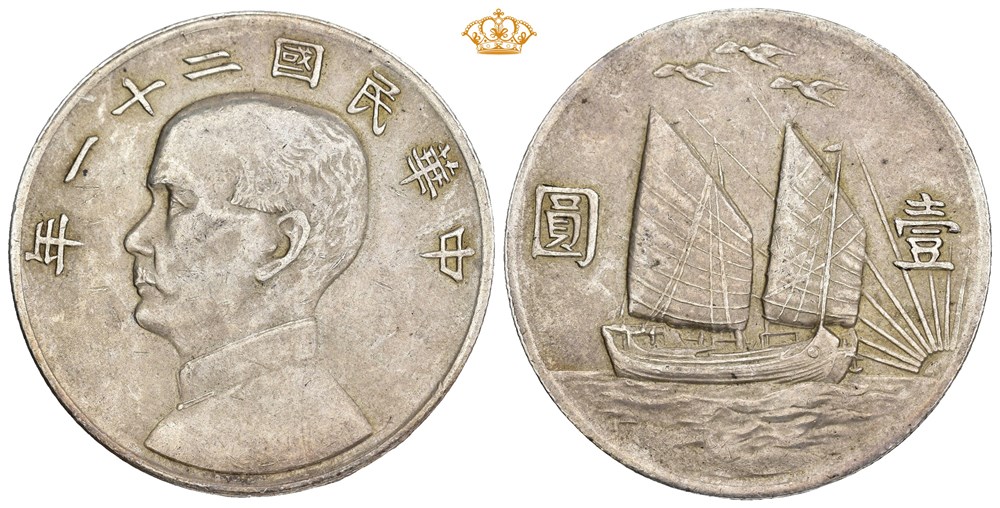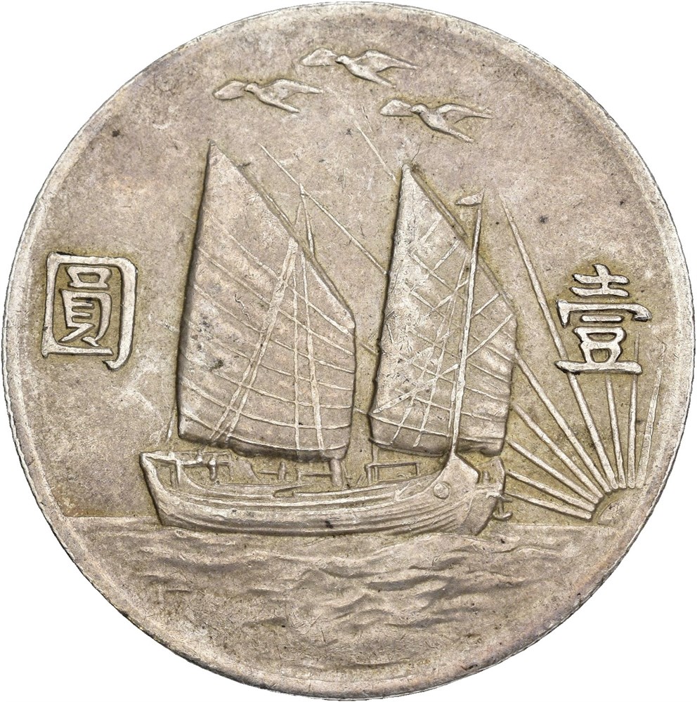 Sun Yat-sen. Dollar n.d. year 21 (1932). "Birds over junk". Very lightly cleaned
