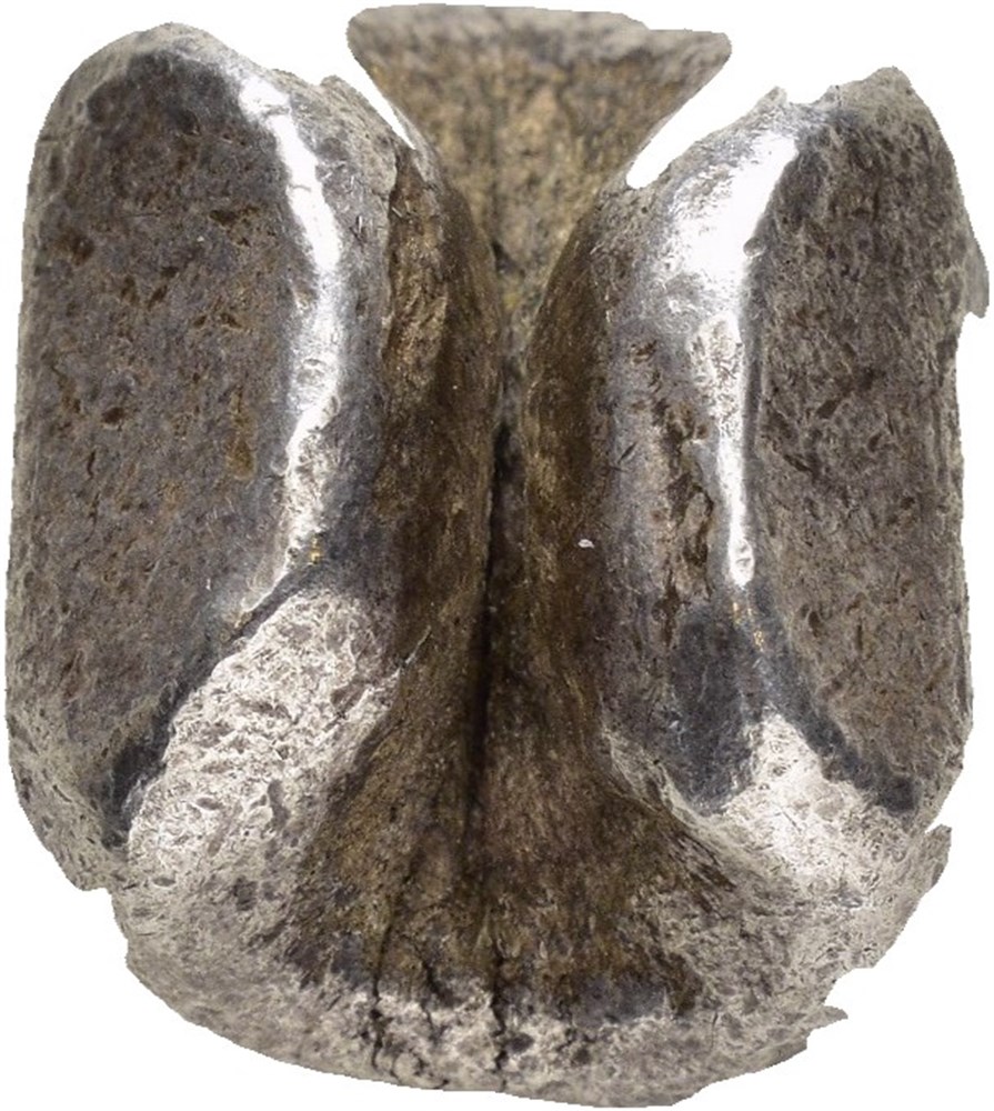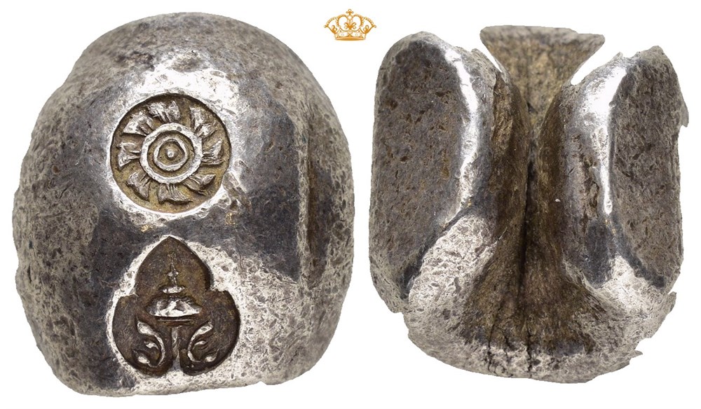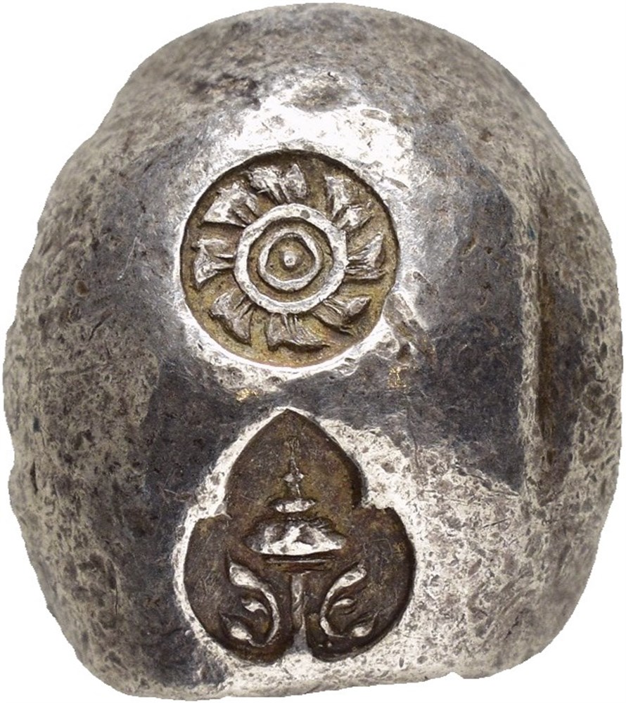 2 baht (1/2 tamlung) bullet money, n.d. (1851-68) (30.22 g). Variety with eight blades in Chakra