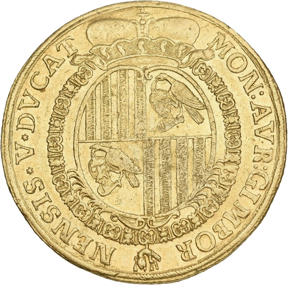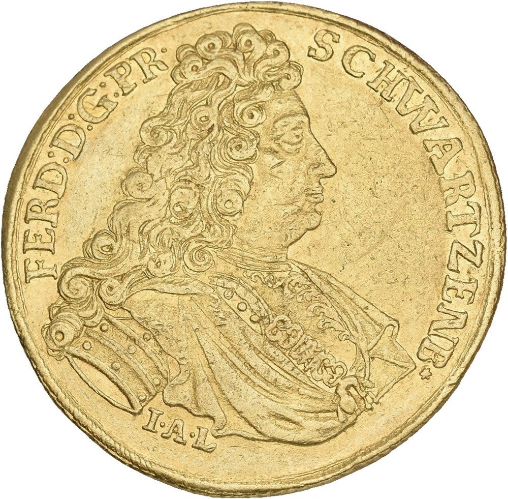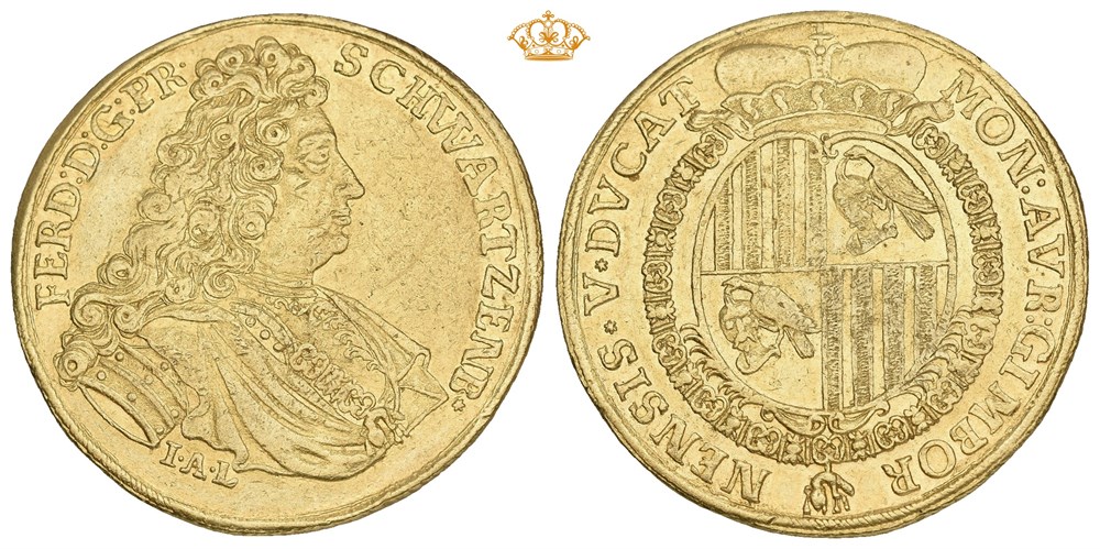 5 ducats 1701 IAL (17.08 g). Struck in Köln for the county of Gimborn, Schwarzenberg. Small scratch in obverse field. An extreme rarity