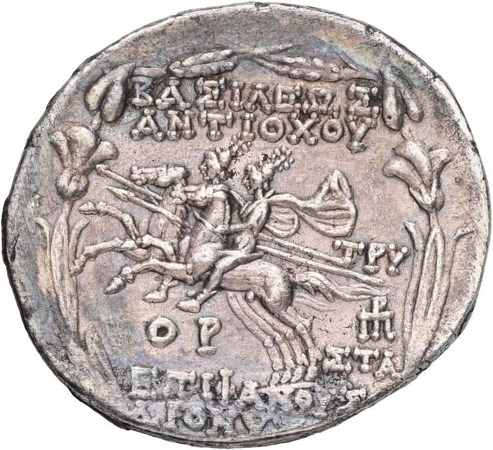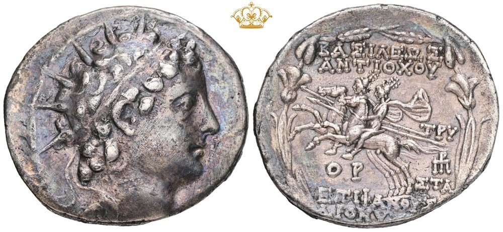 SELEUKID KINGS. Antiochos VI Dionysos, 144-142 BC. AR tetradrachm (31.0 mm, 15.53 g). Antioch on the Orontes mint. Dated SE 170 (=143/2 BC). Radiate and diademed head right / BAΣIΛEΩΣ / ANTIOXOY / EΠIΦANOYΣ / ΔIONYΣOY, The Dioskouroi rearing left, both holding reins and long lances; to right, TPY above monogram above ΣTA; OP (date) beneath horses; all within laurel wreath. Cleaning scratches in fields. Iridescent toning