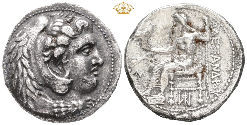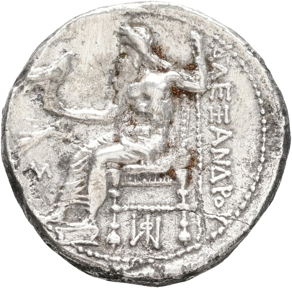 KINGS of MACEDON. Alexander III (The Great), 336-323 BC. AR tetradrachm (27.0 mm, 14.42 g), Babylon mint, struck under Stamenes or Archon, circa 324/3. Head of Herakles right, wearing lion skin headdress / AΛEΞANΔPOY, Zeus seated left on throne, holding eagle in outstretched right hand and resting on grounded scepter with left; In left field, Nike flying right, holding wreath; to lower left, M; below throne, monogram. Brushed and with some corrosion. Toned