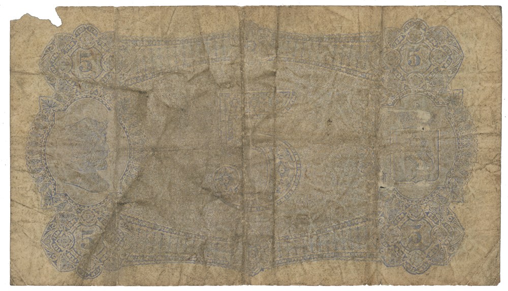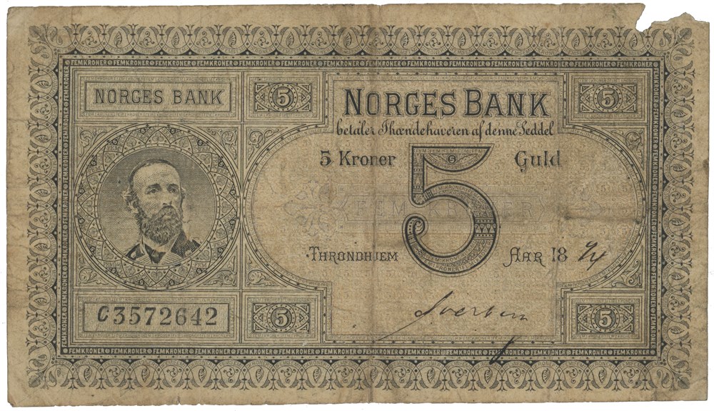 5 kroner 1894. C3572642. Signert Soelberg. Falmet og manglende hjørne/faded and missing corner.