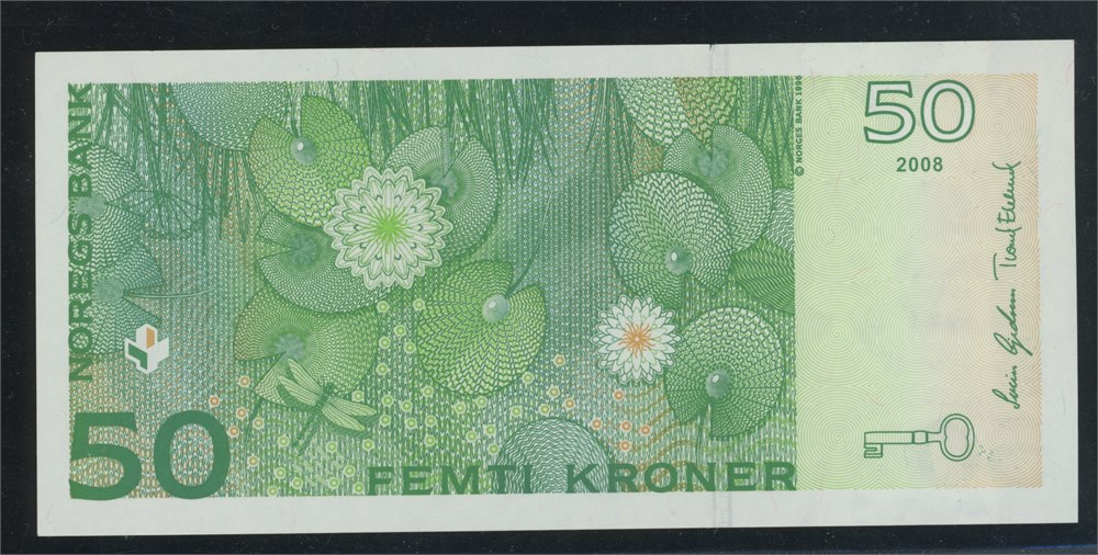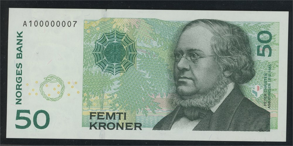 50 kroner 2008. A100000007. Veldig lavt serienummer, fra øvre venstre hjørne i ark nummer 7 som ble trykket.