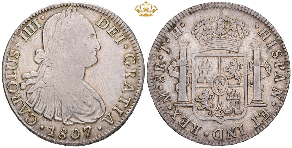 8 reales 1807 Mo TH (26.90). Mexico City mint. Lightly cleaned
