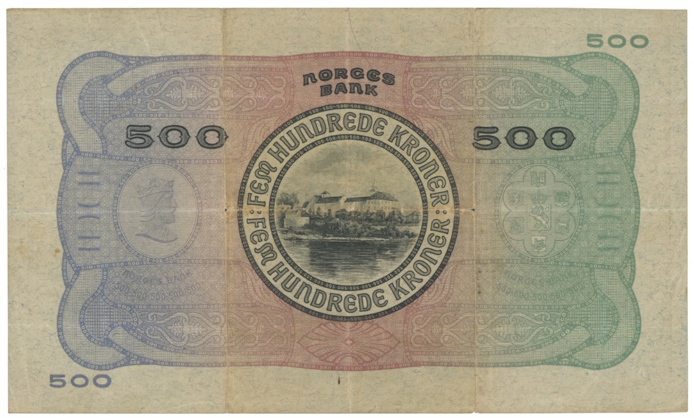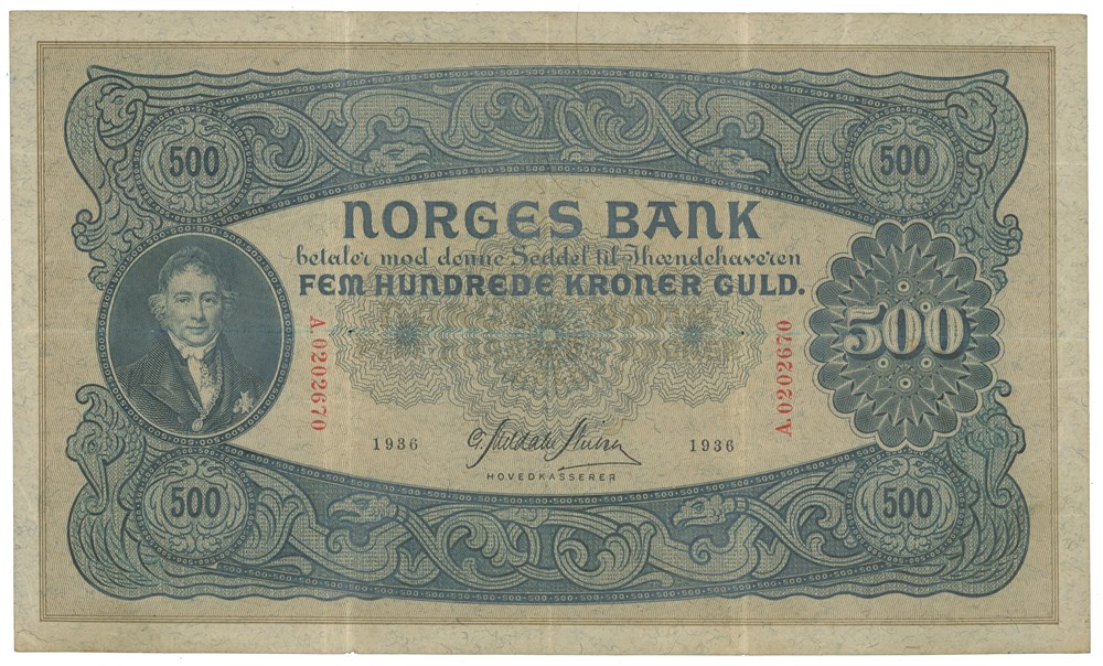 500 kroner 1936. A.0202670. To små hull midt på seddelen/two tiny holes.