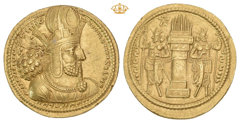 SASANIAN KINGS. Shahpur I, AD 240-272. AV dinar (22.0 mm, 7.34 g). Ctesiphon mint, circa AD 260-272. mzdysn bgy šhpwhry MRK’n MRK’ ’yr’n MNW ctry MN yzd’n in Pahlavi, Diademed bust right, wearing mural crown with korymbos; pellets in field to left / nwr’zy in Pahlavi to right, šhpwhry in Pahlavi to left; fire altar flanked by two attendants; fravahr to left of flames. A clear and attractive specimen