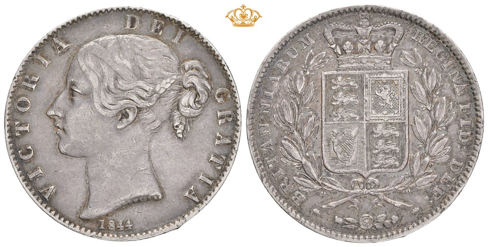 Crown 1844. London mint. VIII tar stops edge. Lightly cleaned, toned