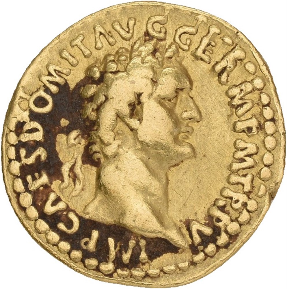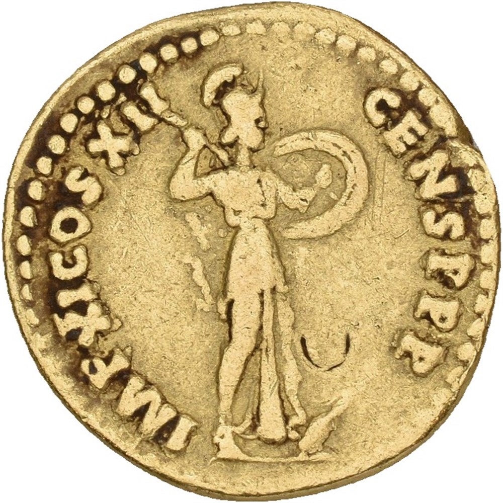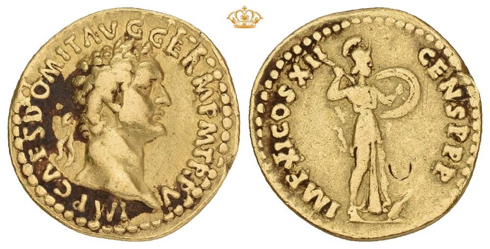 Domitian, AD 81-96. AV aureus (20.0 mm, 7.35 g). Rome mint, struck AD 86. Laureate head right / Minerva advancing right, brandishing spear with right hand and holding shield in left. Struck on a broad flan. Banker's mark in reverse field and a few light marks. Some deposits. Rare