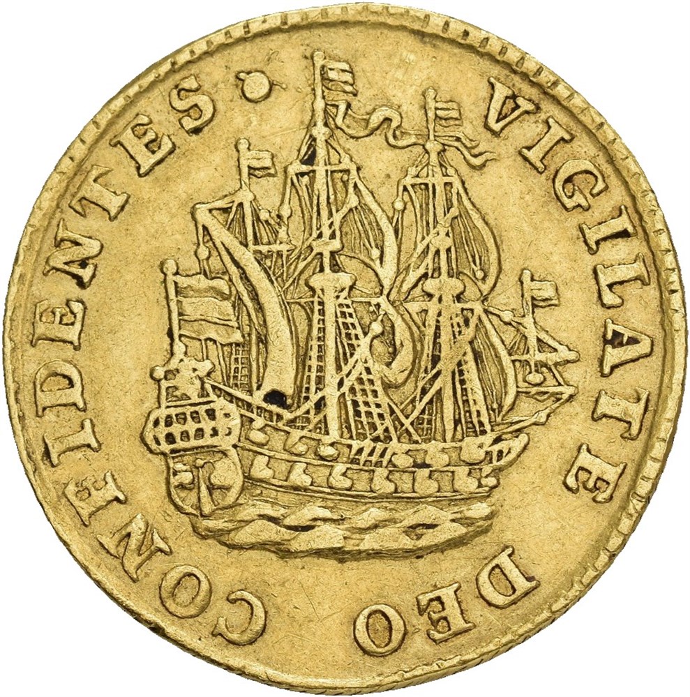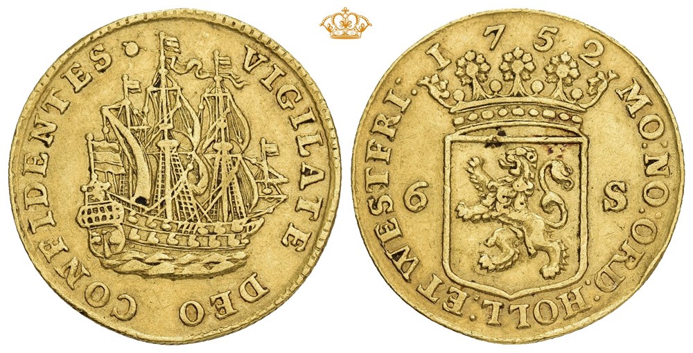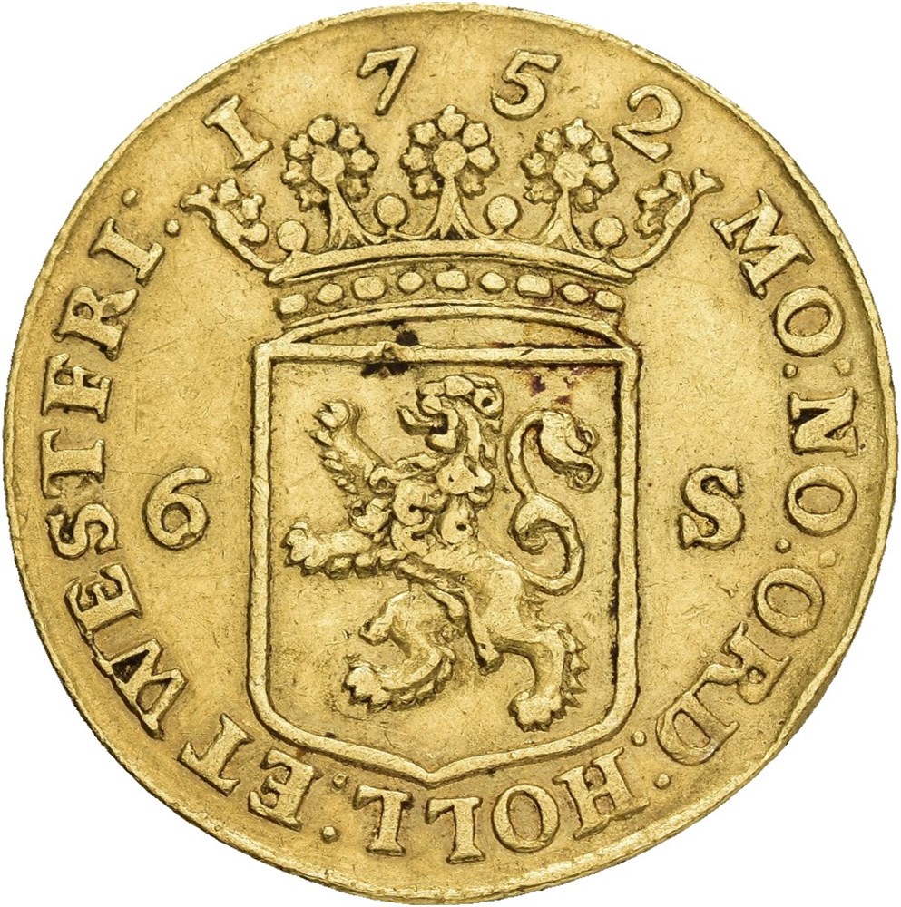 Gold strike of 6 stuivers 1752 (6.82 g). Lightly creased. Rare