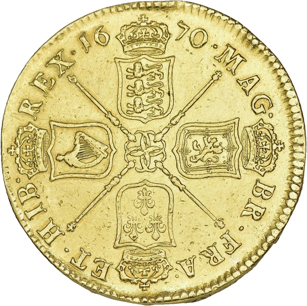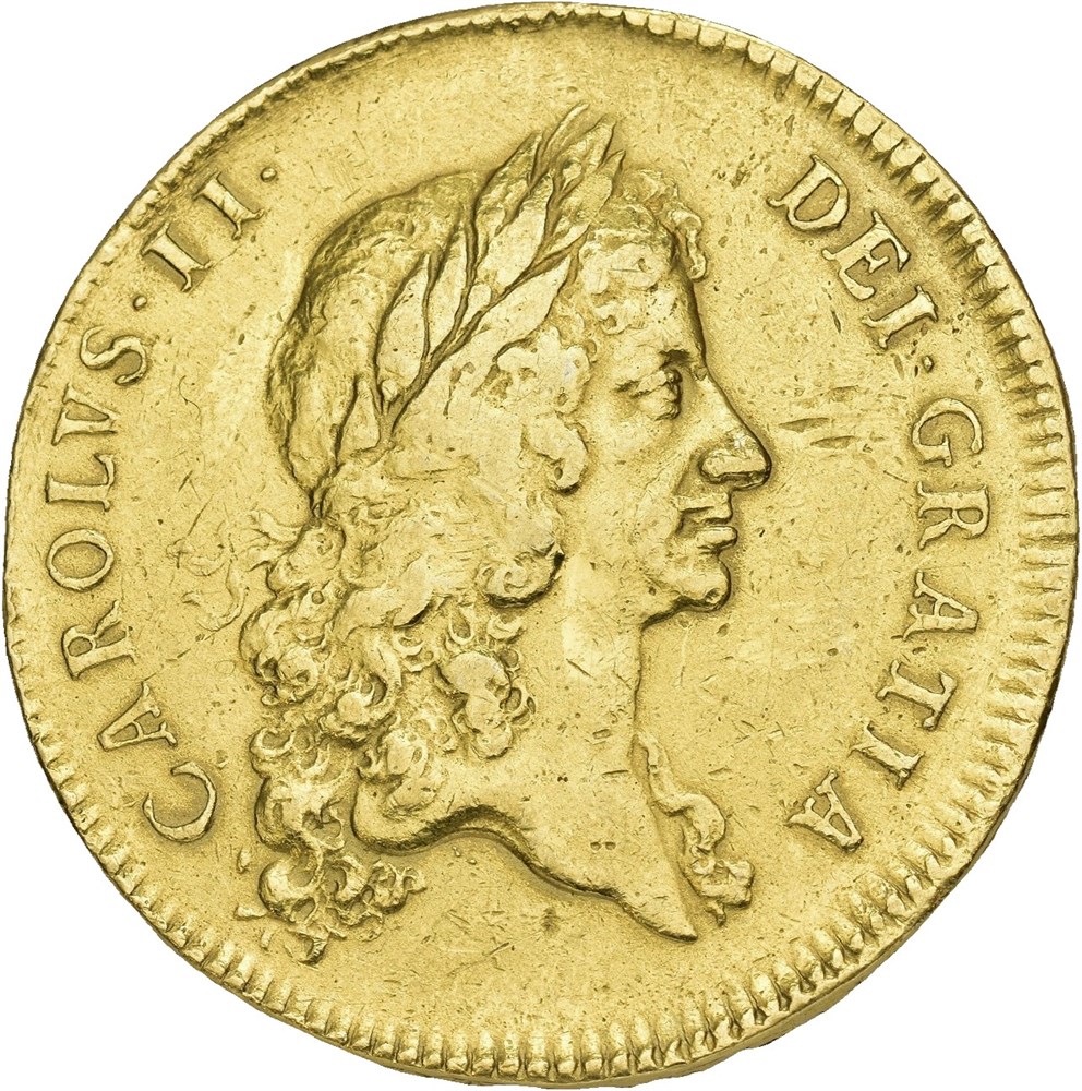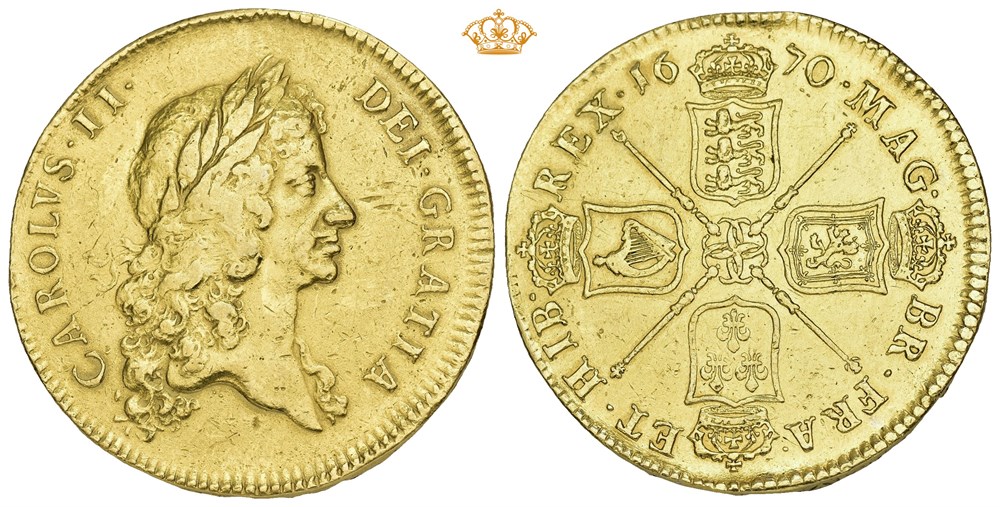 5 guineas 1670 (40.85 g). London mint. Several nicks and scratches. Cleaned