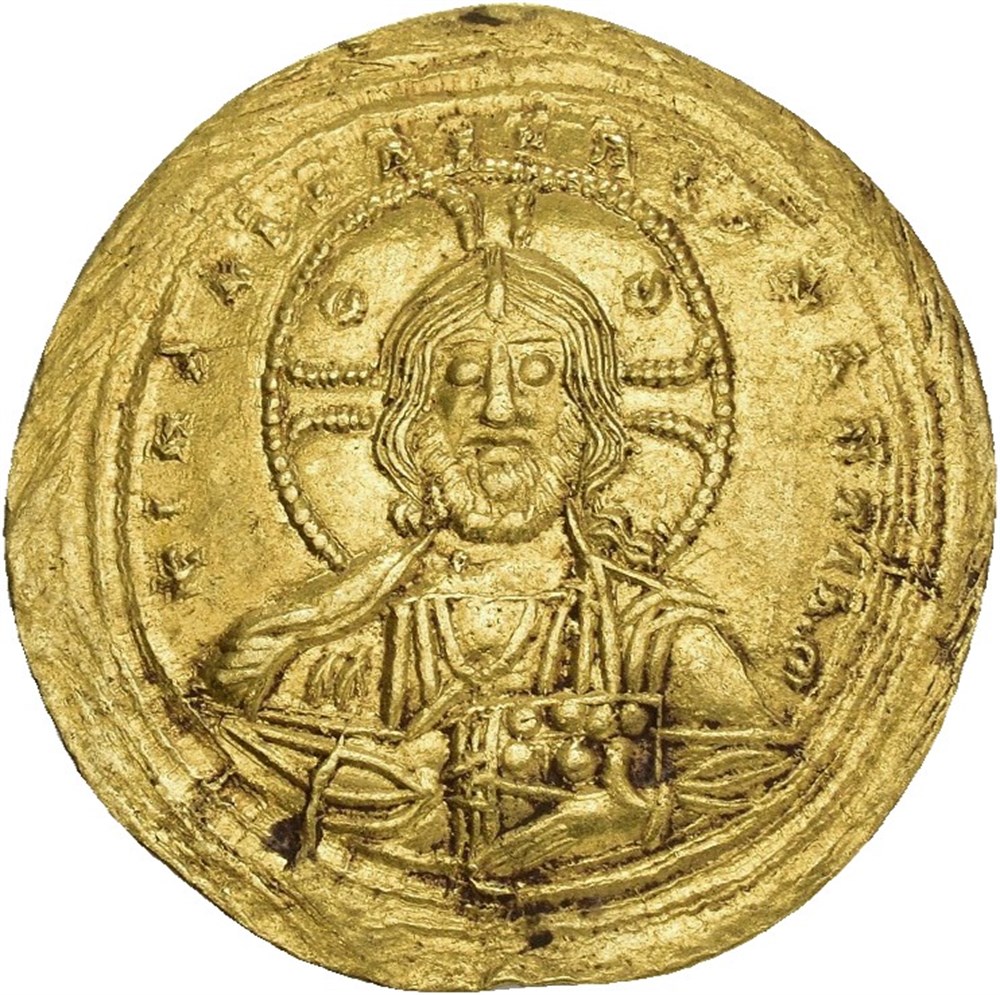 Constantine VIII, AD 1025-1028. AV histamenon nomisma (25.5 mm, 4.41 g). Constantinople mint. Facing nimbate bust of Christ Pantokrator, raising hand in benediction and holding Gospels; crescents in upper two quarters of nimbus / Crowned facing bust of Constantine, wearing jeweled loros, holding labarum and akakia. A clear and attractive specimen with a few traces of earthen deposits on obverse