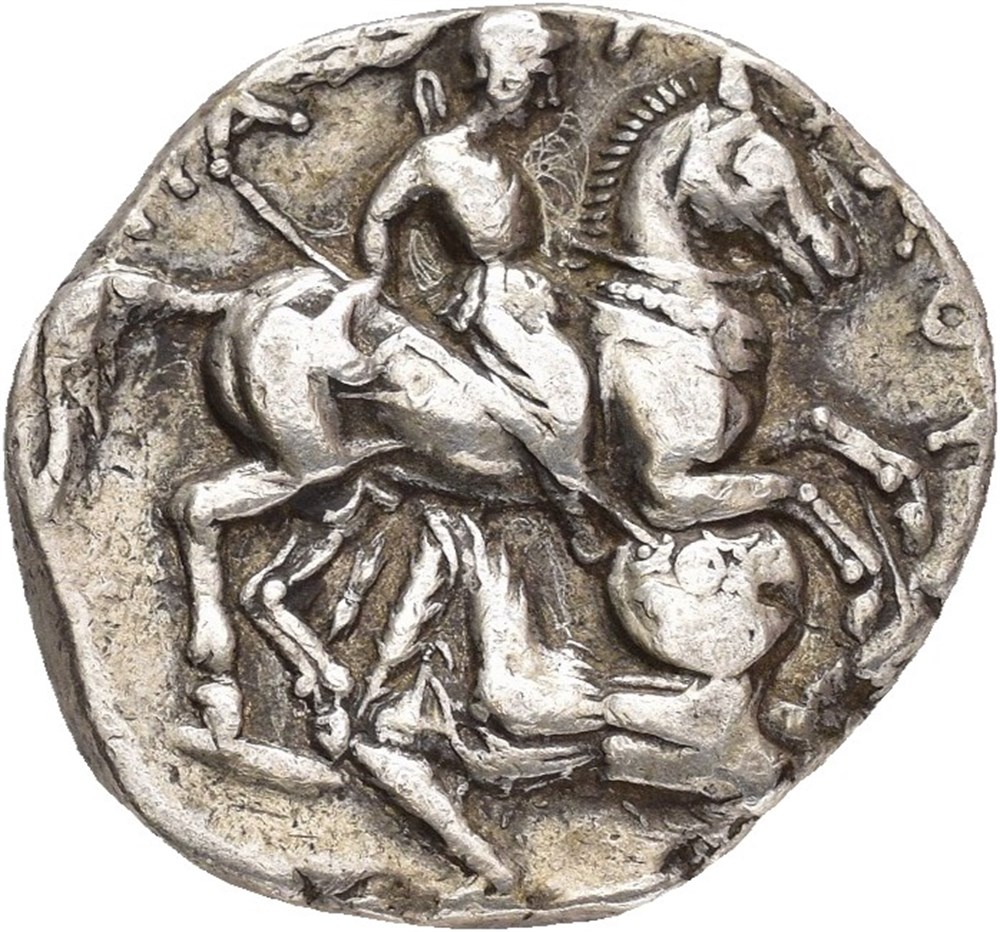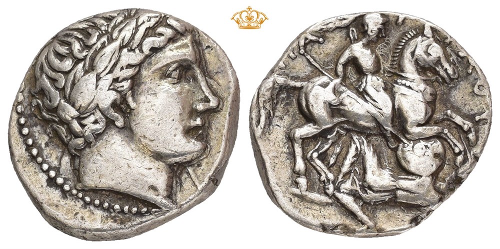 KINGS of PAEONIA. Patraos, circa 335-315 BC. AR tetradrachm (23.0 mm, 13.00 g). Astibos or Damasteion mint. Laureate head of Apollo right / ΠATPAOY, Warrior on horseback charging right, thrusting spear at enemy lying below who defends himself with shield; thunderbolt below hore. Struck on a tight flan. Light iridescent cabinet toning