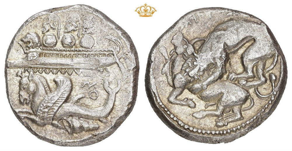 PHOENICIA, Byblos (Gebal). 'Ozba'al, circa 400-365 BC. AR shekel (23.5 mm, 13.11 g). Three hoplites, holding shields, standing left on galley, prow ending ornate with lion's head; below, hippocamp swimming left above murex shell; 'Z (= Oz[baal], in Phoenician) above dorsal fin / Lion attacking bull left; ['ZB'L ML]K GBL (= Ozbaal, king of Gebal, in Phoenician) above. Some areas of weak strike. Lightly toned