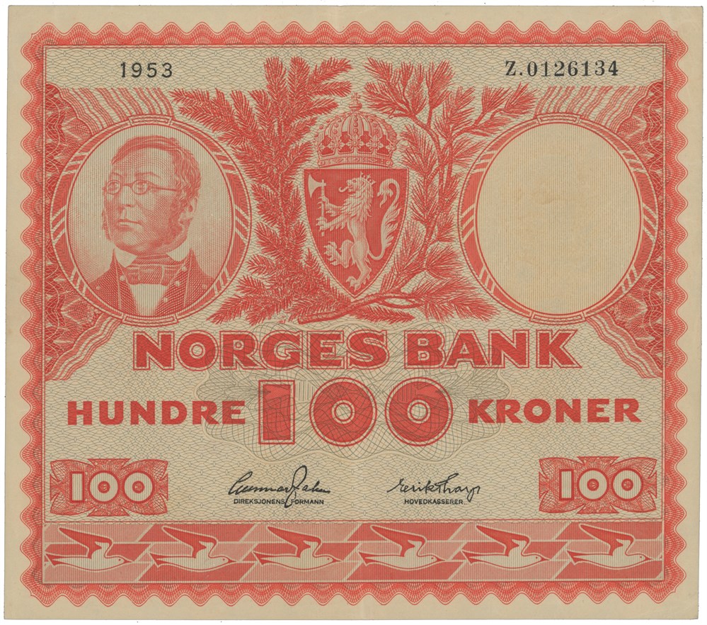 100 kroner 1953. Z.0126134. Erstatningsseddel/replacement note (0-million). Sjelden/rare.