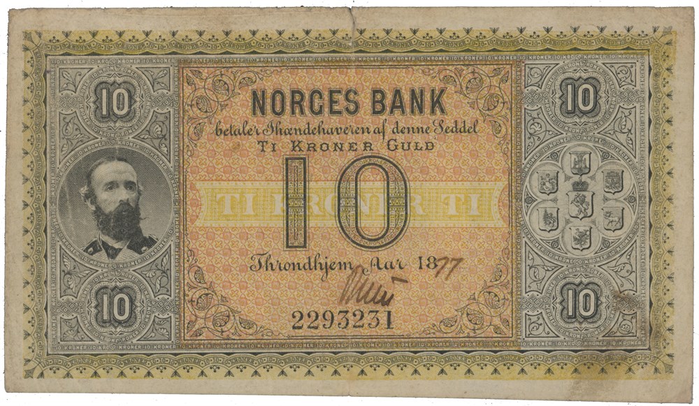 10 kroner 1877. 2293231. Signert Meier. Brettrift oppe/fold tear.