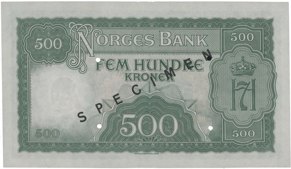 - 500 kroner 1942. A000018. Overtrykt SPECIMEN i sort og perforert med 4 hull. (14778369)