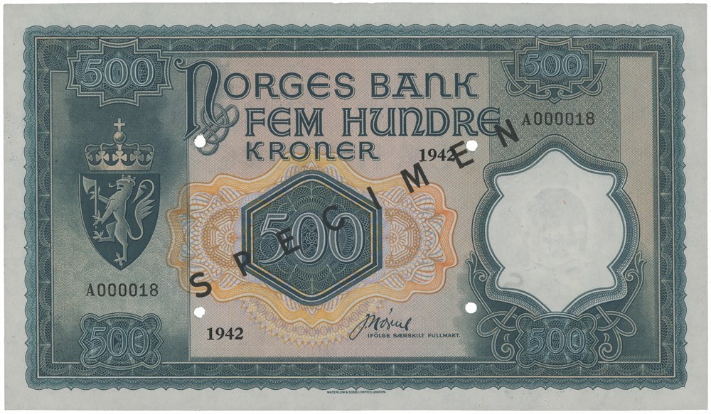 - 500 kroner 1942. A000018. Overtrykt SPECIMEN i sort og perforert med 4 hull. (14778369)
