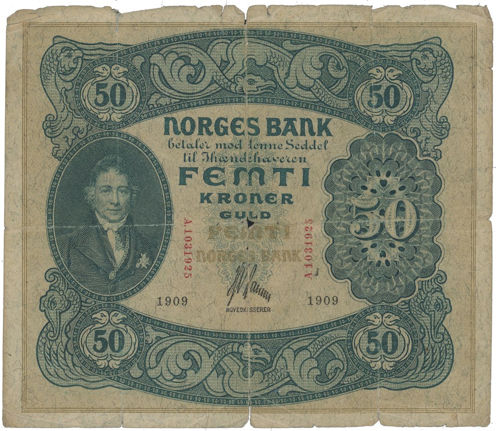 50 kroner 1909. A.1031925. Meget sjelden/very rare.