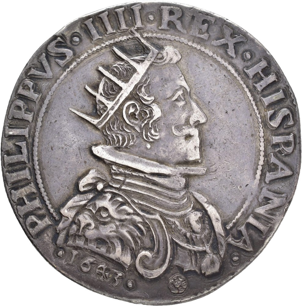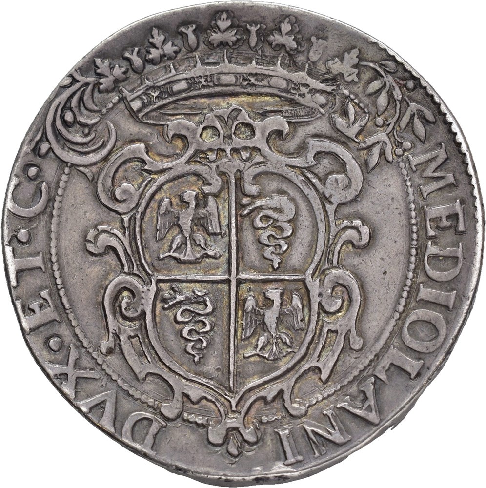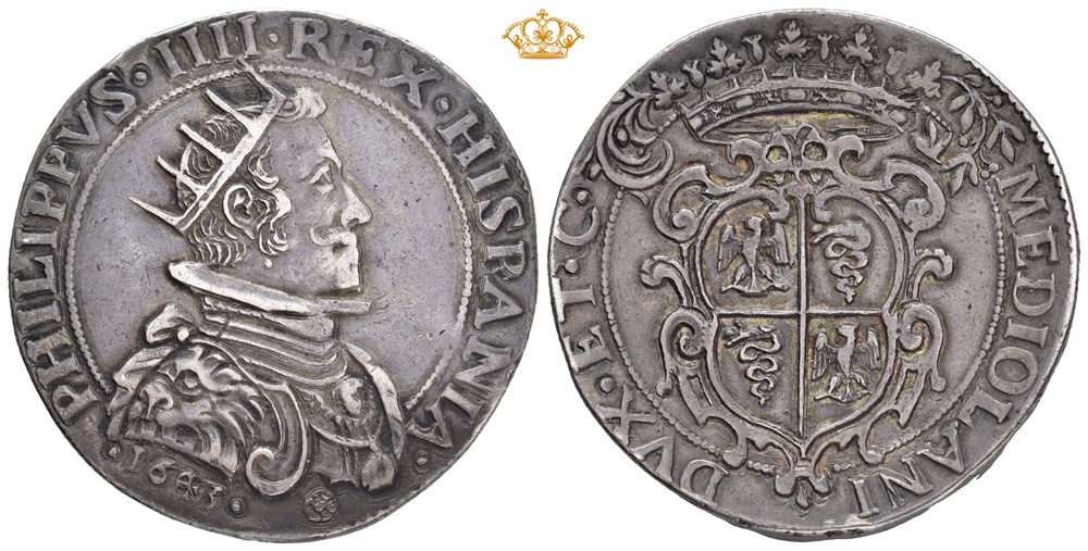 2 ducatoni 1643 (63.65 g). Milano mint. Wonderful deep iridescent cabinet toning. Extremely rare and only 8 specimens known by Crippa