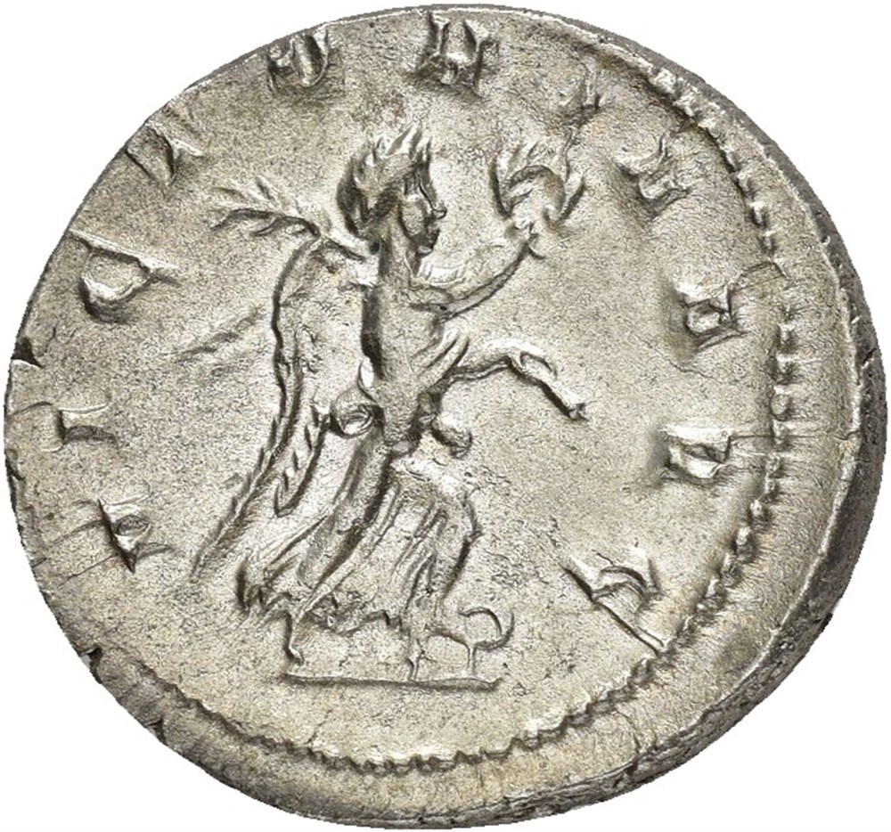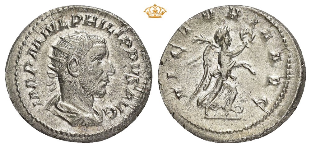 Philip I, AD 244-249. AR antoninianus (23.5 mm, 4.81 g). Rome mint, struck AD 244. Radiate, draped and cuirassed bust right / Victory advancing right, holding wreath and palm frond. Clear and attractive. Lightly toned