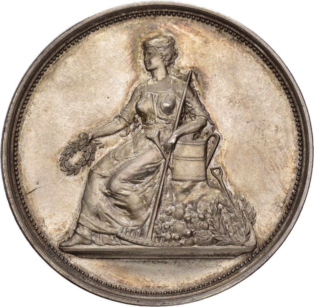 Havedyrkningens venner, stiftet 6. februar 1884. Throndsen. Sølv 45 mm; 39,1 g. I originalt etui.