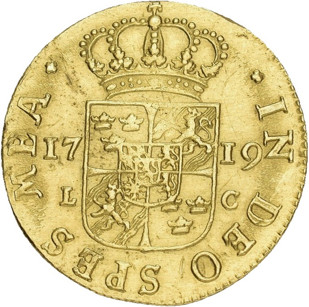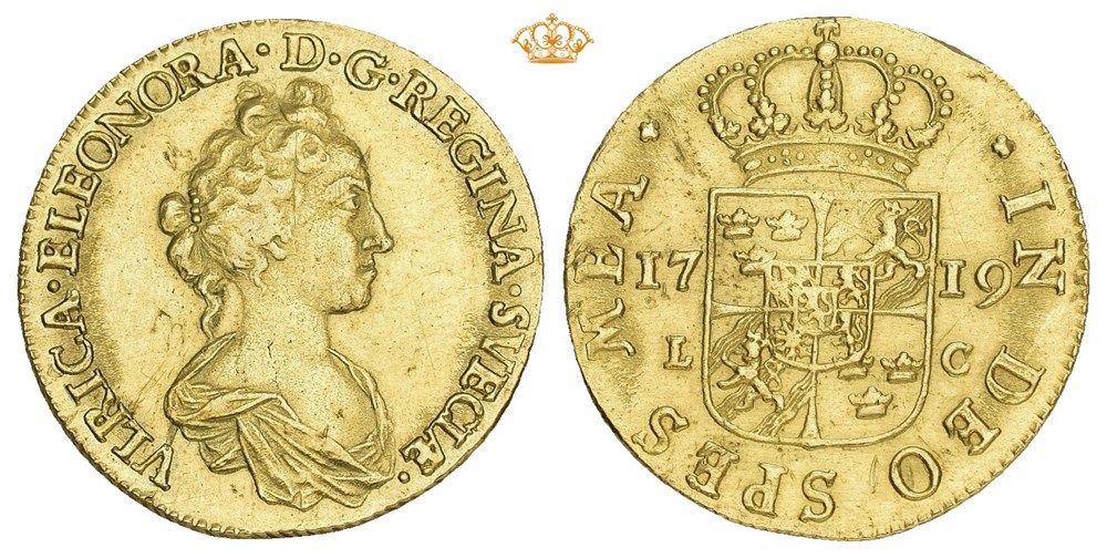 2 dukat 1719 (7.50 g). Stockholm. Lett pusset og med små filmerker på kanten / lightly brushed and minor edge filing
