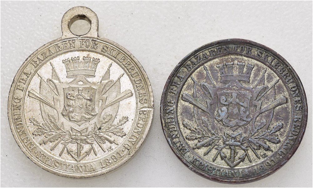 Erindring fra bazaren for skibbrudnes redning. Kristiania 1891. Throndsen. Lot 2 medaljer i forsølvet bronse med og uten hempe. 23 mm. Hakk på advers på medaljen med hempe/Peck on obverse on medal with loop