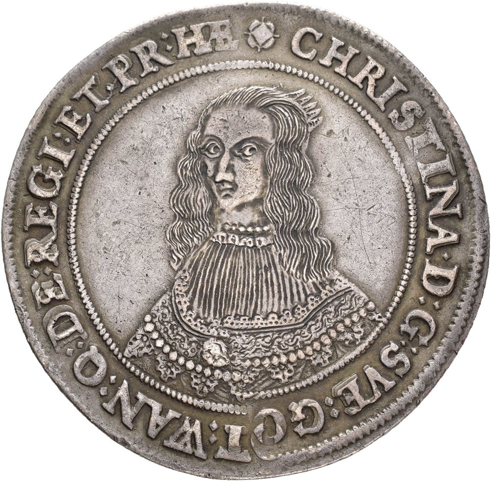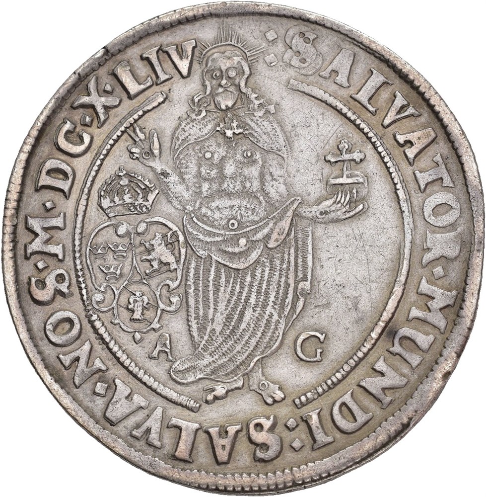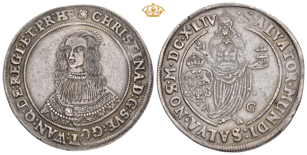 Riksdaler 1644 (28.30 g). Stockholm. Sjeldnere variant med stort myntmerke (A-G) på revers. Oppgravert på advers/tooled on the obverse