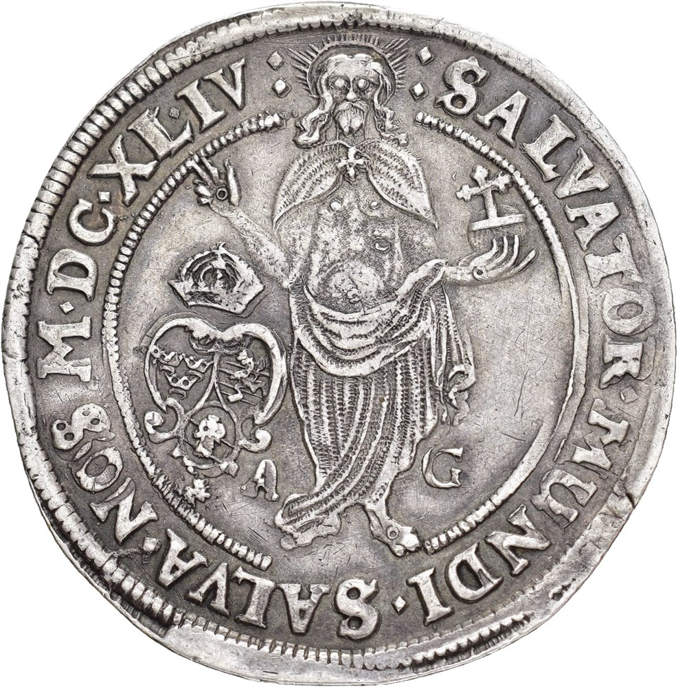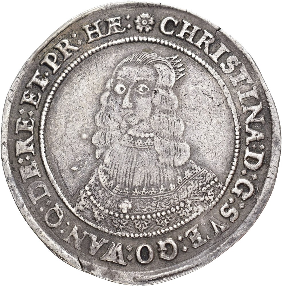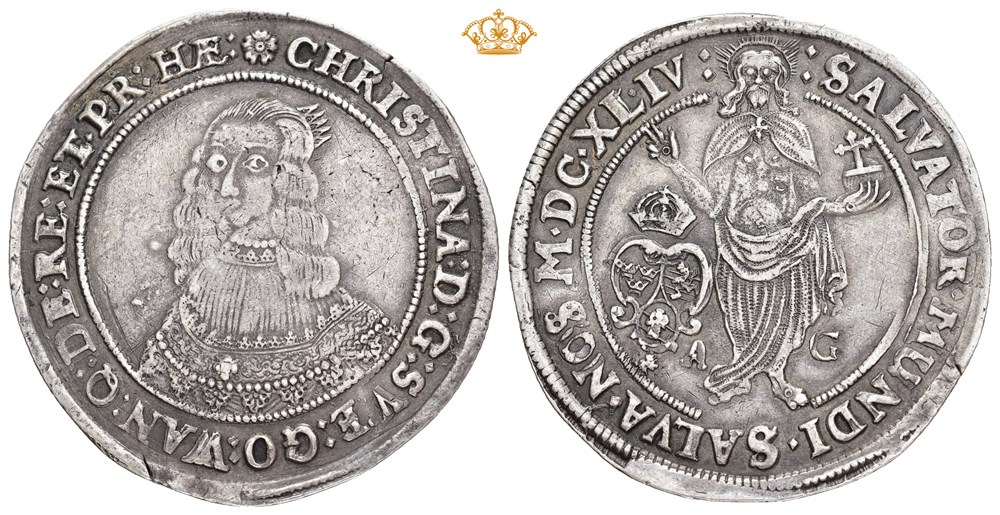 Riksdaler 1644 (28.36 g). Stockholm. Sjeldnere variant med stort myntmerke (A-G) på revers. Små spor av anheng langs randen og noen små riper / slight traces of mounting along the edge and a few scratches