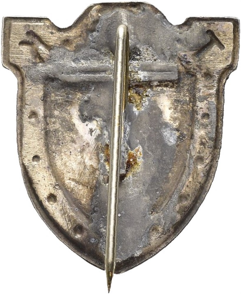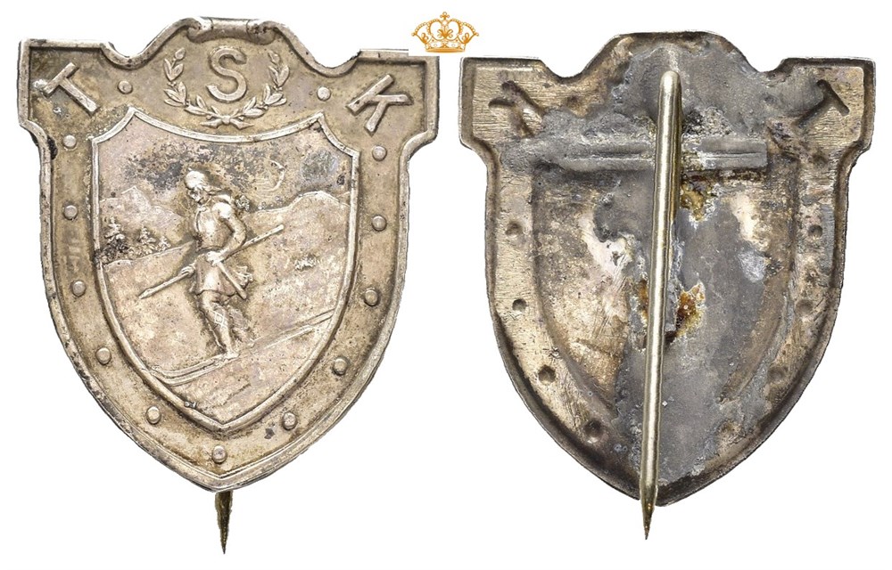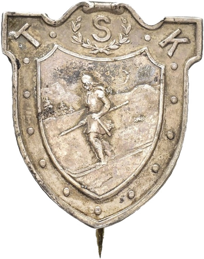 T S K, Trondhjems Skiklubb, ensidig merke med nål. Throndsen. Sølv 26x23 mm; 2,50 g