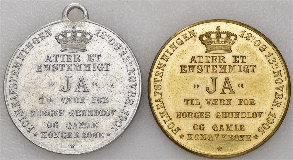 Folkeafstemningen 12te og 13de November 1905. Throndsen. Lot 2 medaljer i aluminium med hempe og tambak. 27 mm