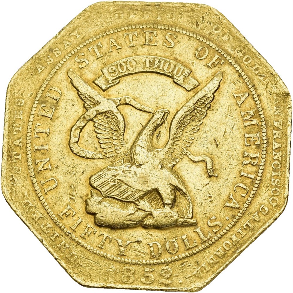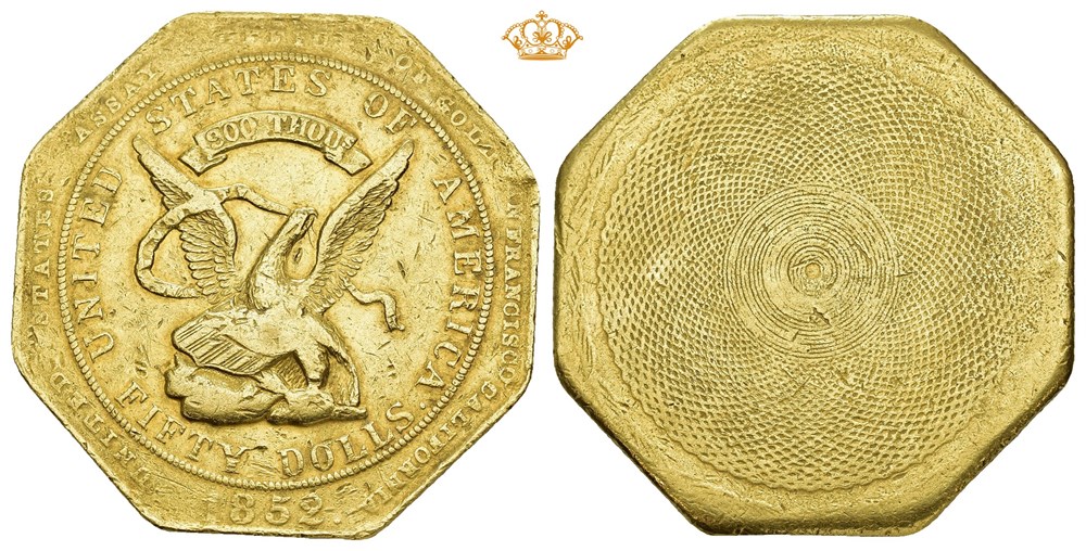 50 dollars 1852 octagonal (83.32 g). United States Assay Office of Gold, San Francisco, California, 1851-1853. Fineness marked as 900 THOUS. A few edge nicks. Extremely rare