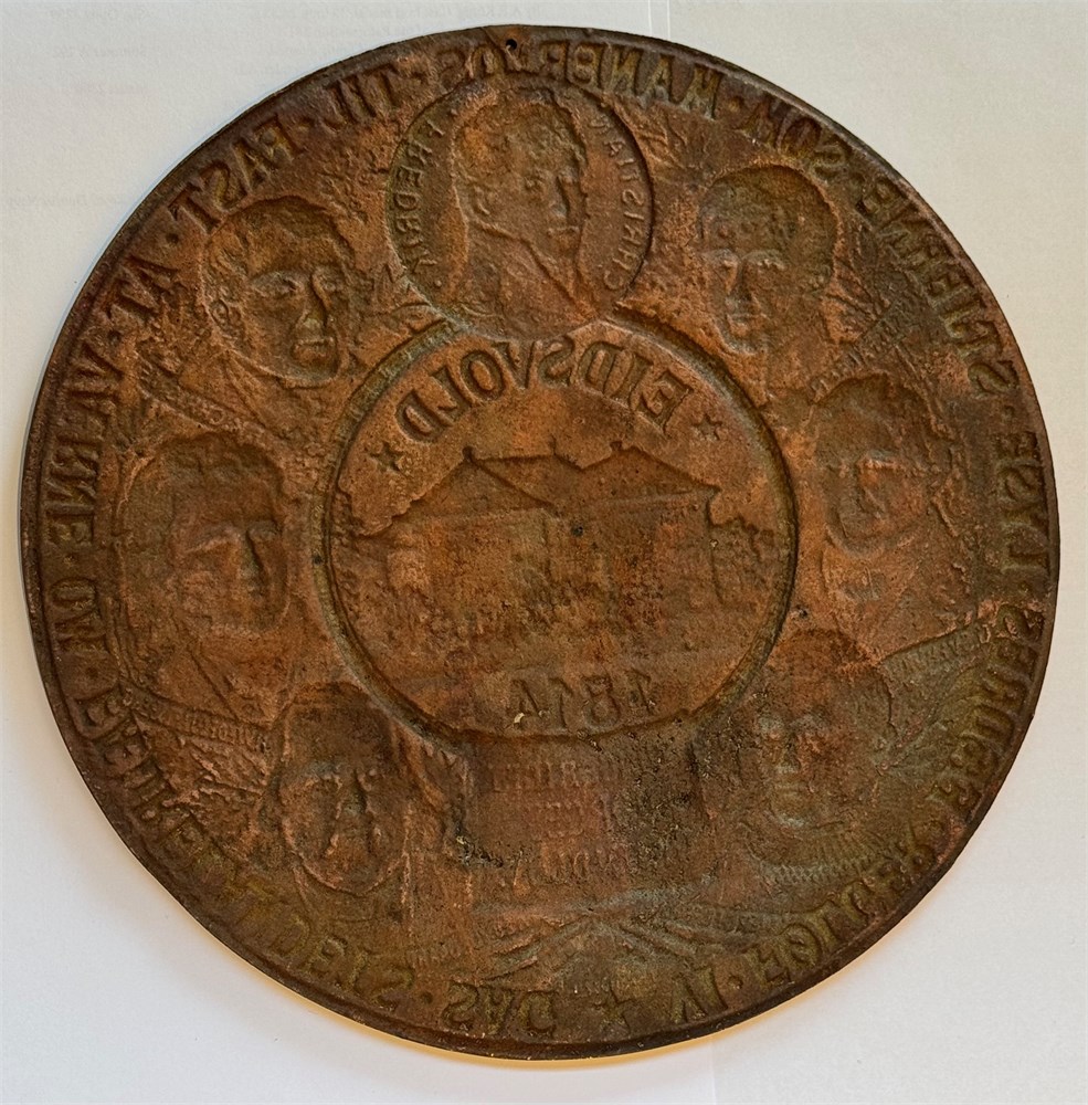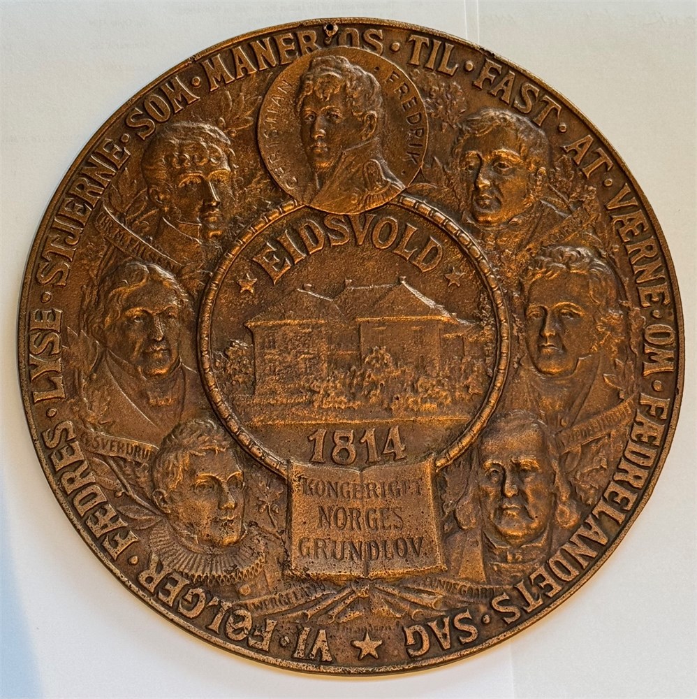 Ensidig rund plakett med reversmotivet fra Grunnlovsmedaljen. Signert Throndsen. Bronse 225 mm; 1150 g. Perforert/pierced