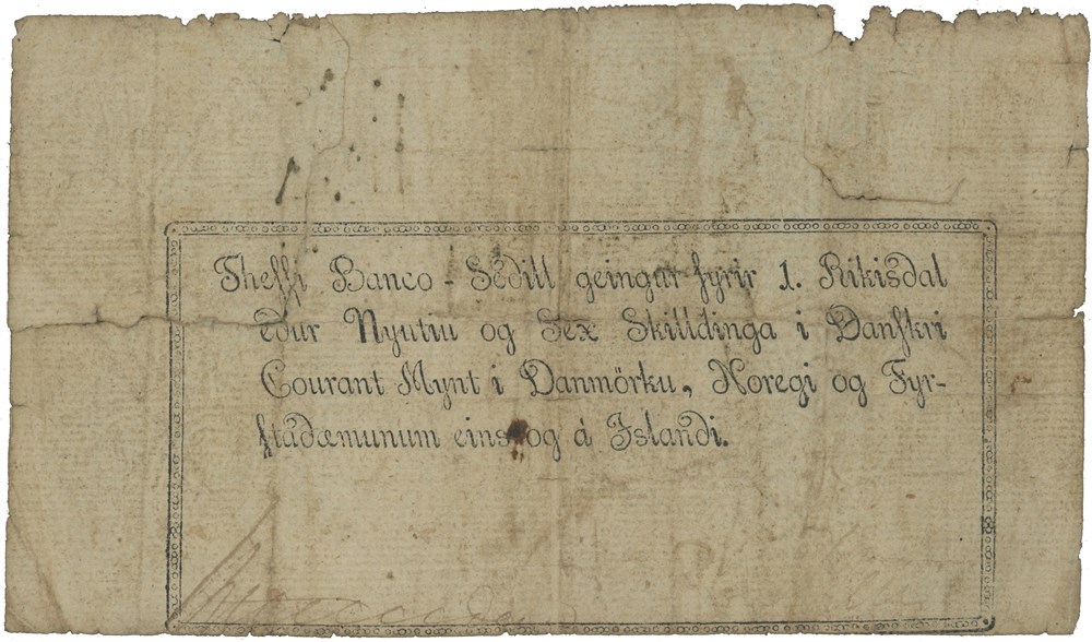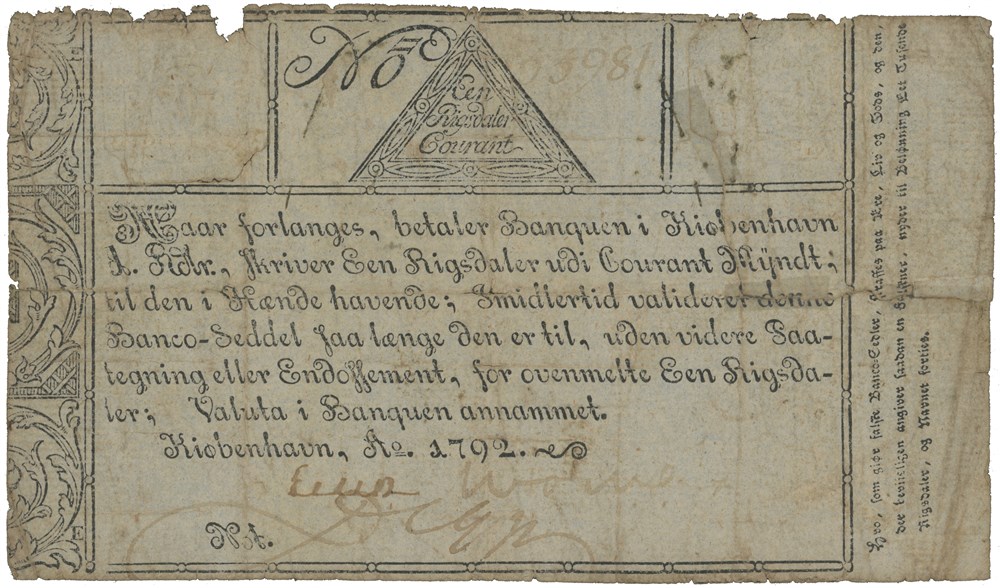 1 rigsdaler courant 1792. No. 55981. Tears and upper right corner repaired.