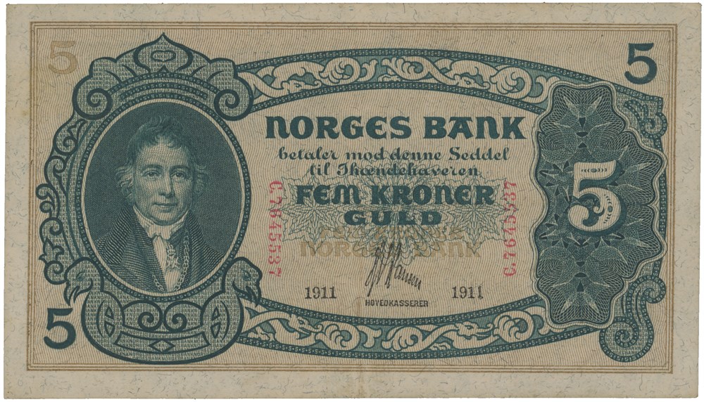 5 kroner 1911. C.7645537. Antikva seddelnummer.