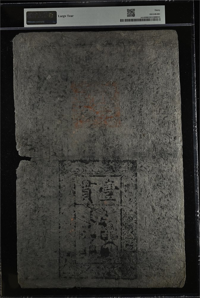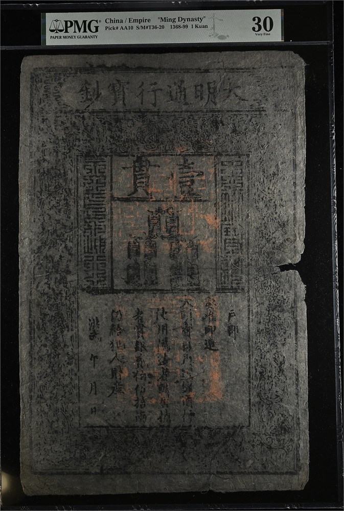 Ming Dynasty, 1368-1644, 1 Kuan (1000 Cash), issued by emperor Hung Wu (1368-99), made of mulberry paper from the mulberry tree, top: six Chinese characters ”Ta Ming T’ung Hsing Pao Cha’s” (Treasure Note of the Great Ming) in K’ai Shu style, at centre: value ”1 Kuan” (Ten Strings) in K’ai Shu style (at this period one String was equivalent to 100 copper cash) with pictorial presentation of Ten Strings (1-Kuan) below, to left: ”T’ien Hsia T’ung Hsing” (To Circulate For Ever And Ever Under The Heavens), to right: ”Ta Ming Pao Cha’o” (Great Ming Treasure Note), Chinese text lower centre meaning ”This note of the Great Ming is printed with the approval of the Hung Wu Emperor (year 1368-1398) through the Hu Pao (the Ming Finance Department) and used side by side with copper cash. Those who counterfeit the Great Ming notes will be beheaded while an informant will be rewarded with 250 Taels of silver and with confiscated property of the convicts into the bargain”, red square seal on the back (equivalent of a signature). In PMG large holder, graded VF 30, large tear.