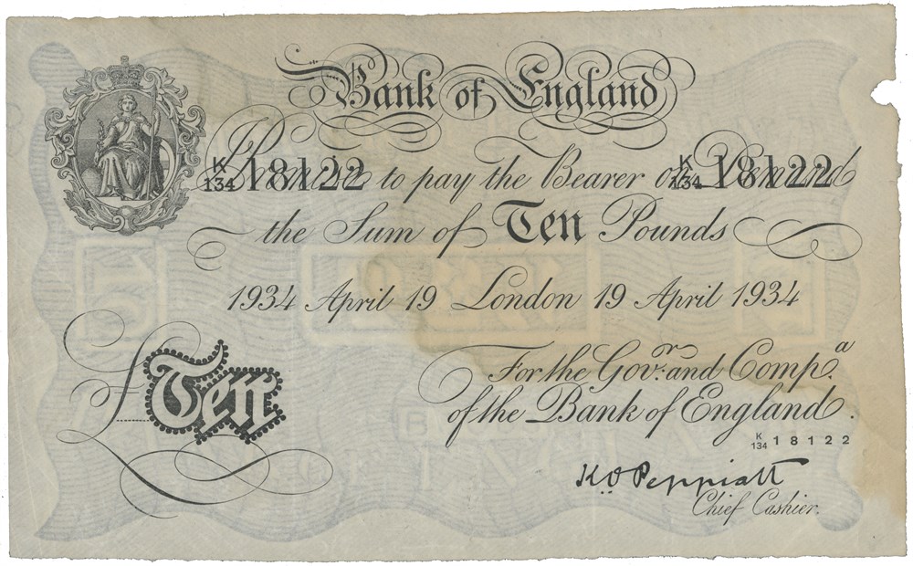 10 pounds London 19.4.1934. No. K/134 18122. Operation Bernhard counterfeit.