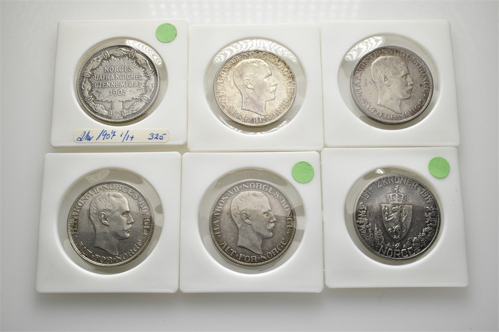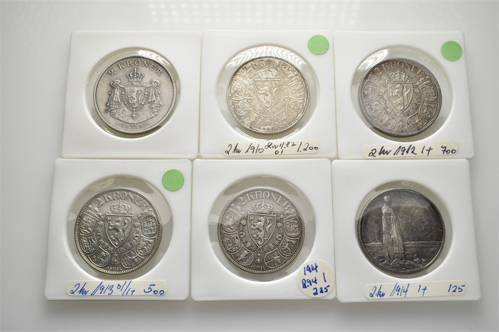 Lot 6 stk 2 kroner 1907, 1910, 1912, 1913, 1914 og 1914 jub.