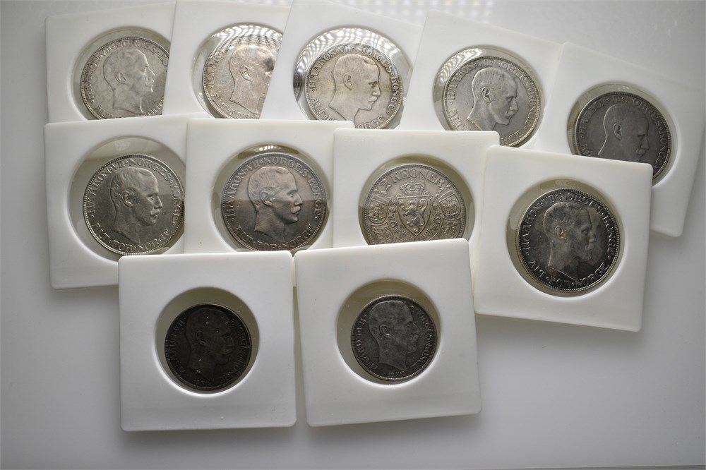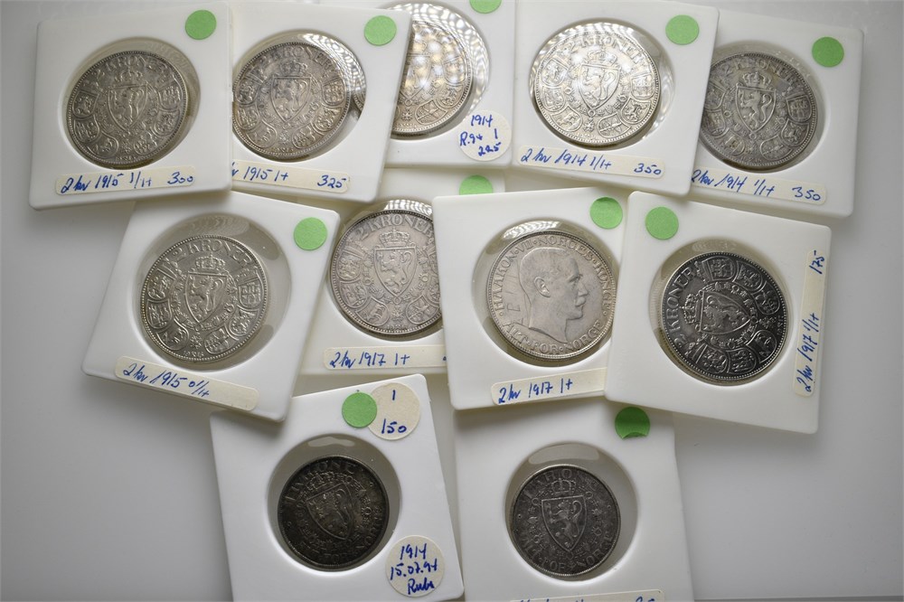 Lot 11 stk. 2 kroner 1914 (3), 1915 (3), 1917 (3) og 1 krone 1914, 1915