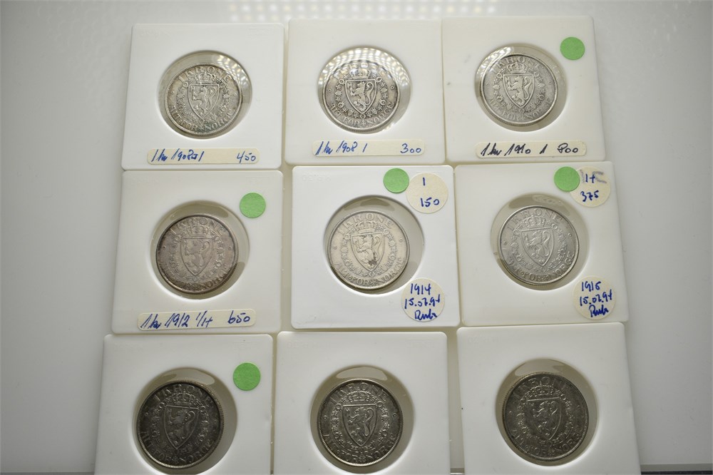 - Lot 9 stk. 1 krone 1908 plate, 1908, 1910, 1912, 1913, 1914, 1915, 1916 og 1917 (15011458)