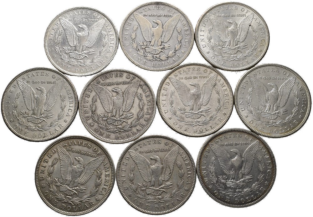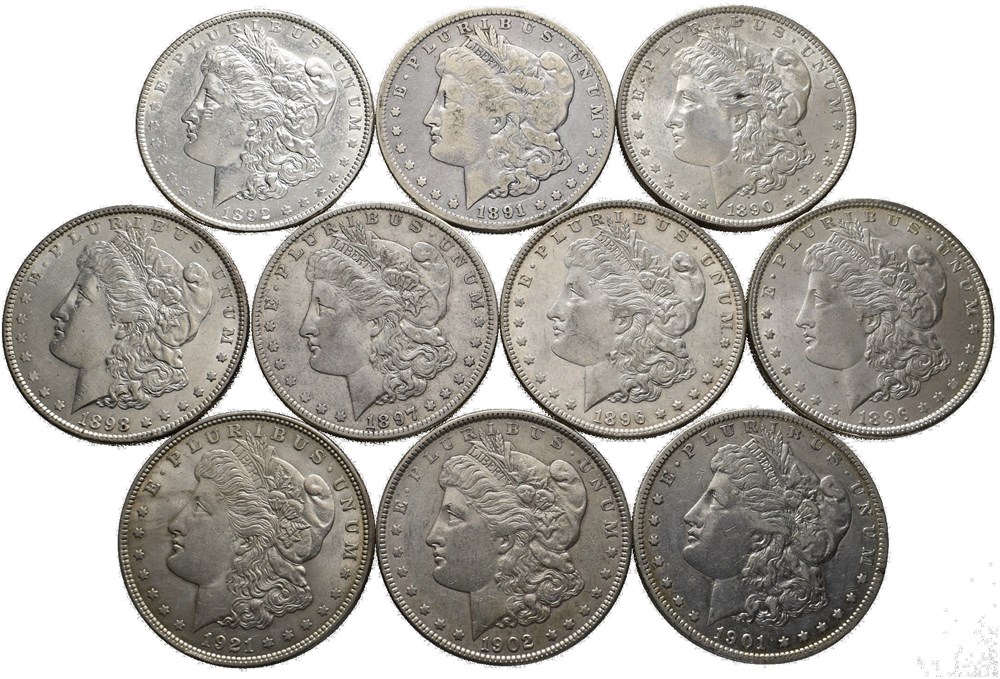 Lot 10 stk. 1 dollar Morgan type; 1890, 1891, 1892, 1896 (2), 1897 O, 1898, 1901 O, 1902 og 1921