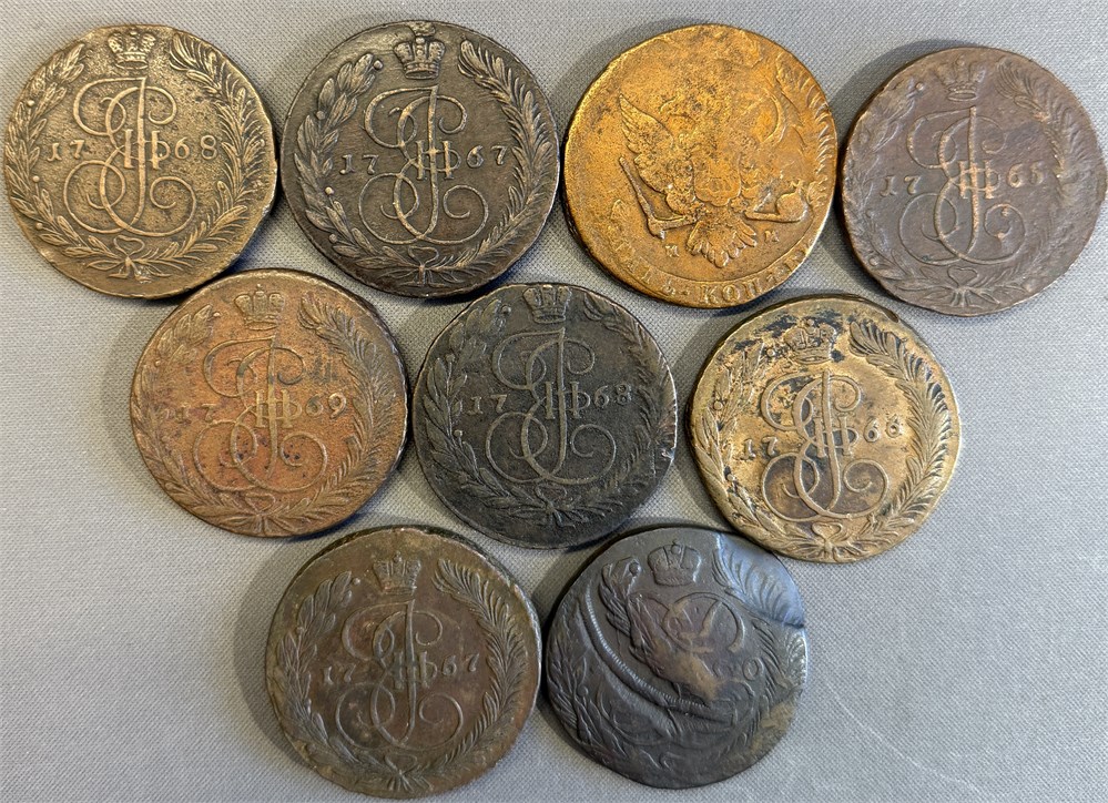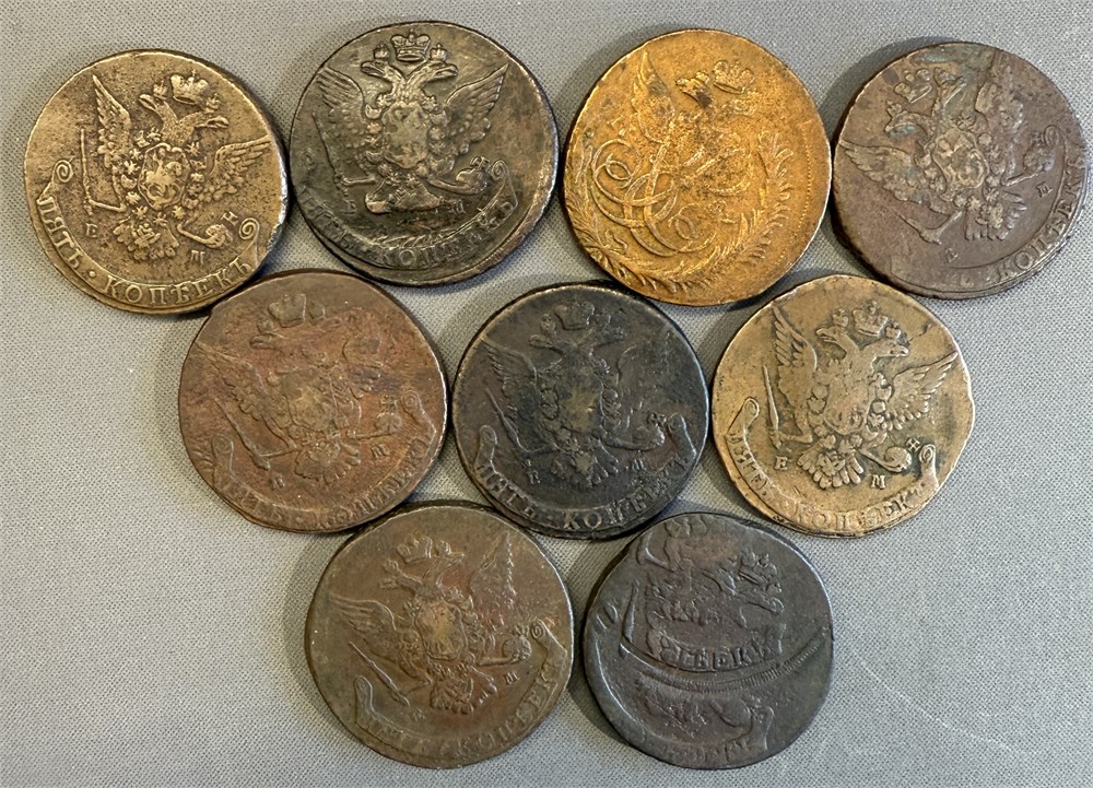 Elizabeth og Catharina II, lot 9 stk. 5 kopek vesentlig EM