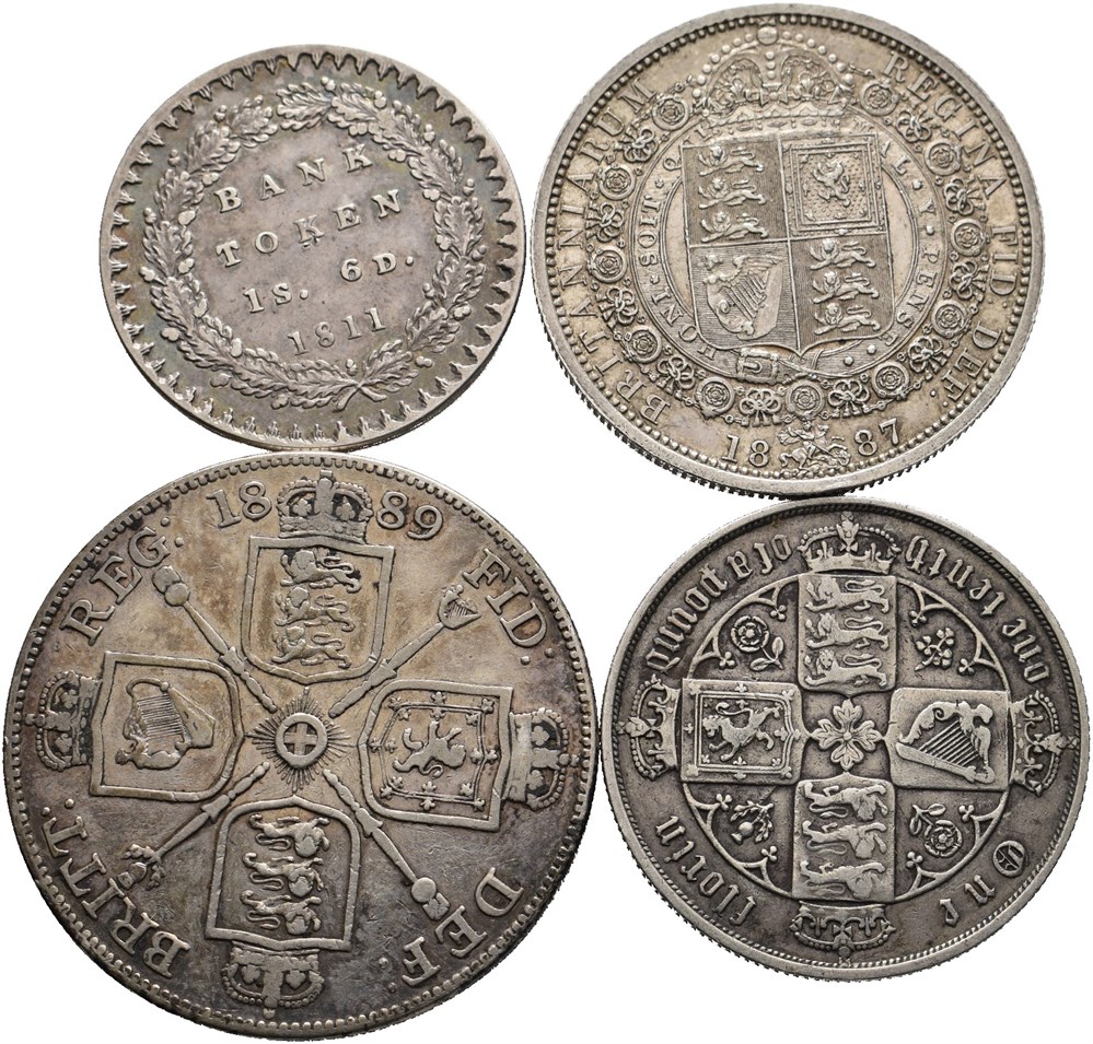 England, George III, 18 pence bank token 1811 (riper), Victoria, dobbel florin 1889, halfcrown 1887, florin 1879