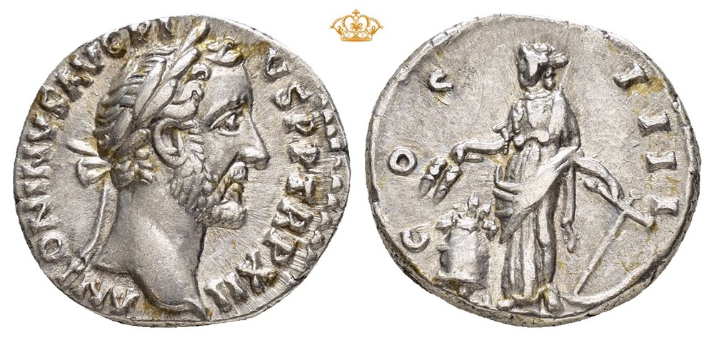 Antoninus Pius 138-161 AD. AR Denarius struck circa 148-149 AD, Rome Mint, 3,28 grams, 18mm. Obverse: ANTONINVS AVG PIVS P P TR P XII, Annona standing, facing left, holding grain ears with right hand over modius, and anchor set on ground with left hand.